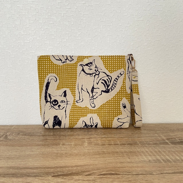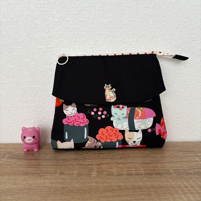 中にファスナーポケットの仕切りがついたポーチです。 ポケットには色違いの猫柄布を使用しました。 3ヶ所に分けて収納できるので便利です。 開閉部にはプラスナップが付いています。 取り外し可能な持ち手が付いていますので、バッグインバッグのように お使いいただけます。 写真8枚目は同じサイズのポーチを使った参考写真です。 ※発送上の注意点※ たたんで梱包するため、 多少のしわが出来る可能性がございます。ご了承ください。 サイズ:入れ口幅23㎝ 高さ17㎝ まち2.5㎝ (内ポケット幅20㎝ 入れ口幅16㎝ 高さ13.5㎝ まちなし)