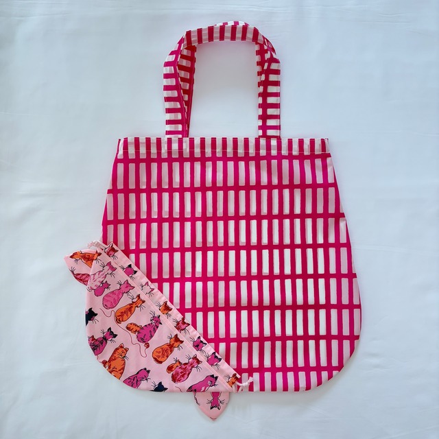 撥水加工生地を使用したエコバッグです。 サイドについているにゃんこがバッグ本体の収納袋になっていますので、 コンパクトに持ち運びできます。 にゃんこの逆サイドからぺたぺたたたんで収納してください。 サイドはバイアステープで縫い代始末をしています。 形はレジ袋のように底のまちが内側に折り込まれているタイプで、まちは広げると12㎝あります。 5枚目の写真は同じサイズのバッグを使った参考写真です。 ※発送上の注意点※ たたんで梱包するため、 多少のしわが出来る可能性がございます。ご了承ください。 サイズ:バッグ:幅41㎝ 高さ34㎝(サイドを計測) まち12cm にゃんこ:幅14㎝ 高さ最長12㎝
