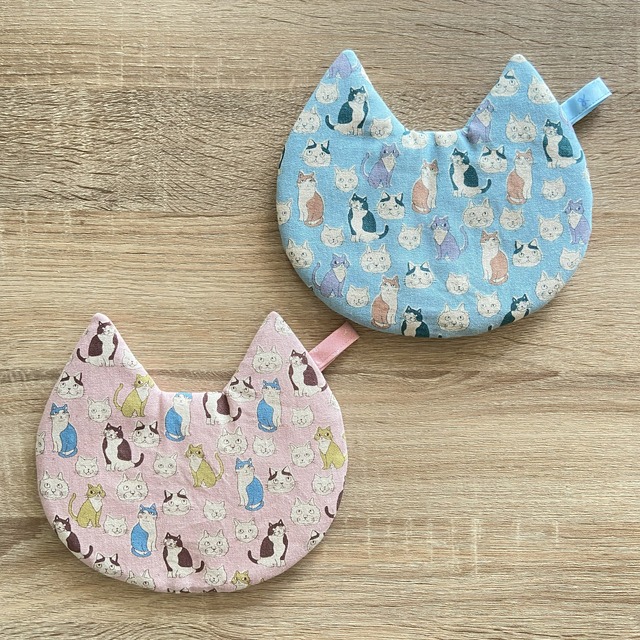猫型の鍋敷き兼鍋つかみです。 裏側は両サイドがポケットになっているので、手を差し込んで鍋つかみとしてお使いいただけます。 手のひら側は猫柄布、キルト芯2枚、キルティング生地の4枚重ねです。 4,5枚目の写真は同じサイズの作品を使った参考写真です。 4枚目の写真は5号の土鍋(一人用)と並べてみました。 ご参考になさってください。 サイズ:縦最長16.5cm 横最長18cm
