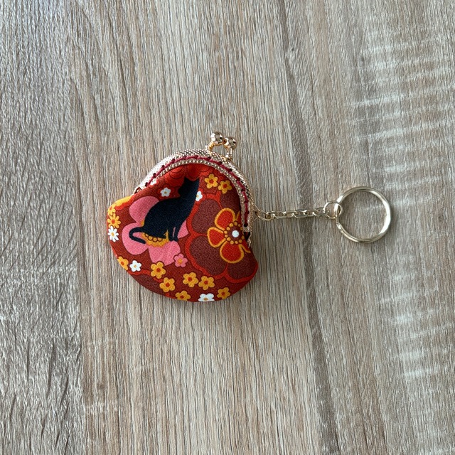 小さな猫型のポーチをキーホルダーにしました。 10㎝ファスナーを使用しています。 底まちは1㎝。 おうちの鍵やリップクリーム、常備薬等を入れると便利です。 ICカードもギリギリ入ります。 サイズ:幅最長9cm 高さ約12cm