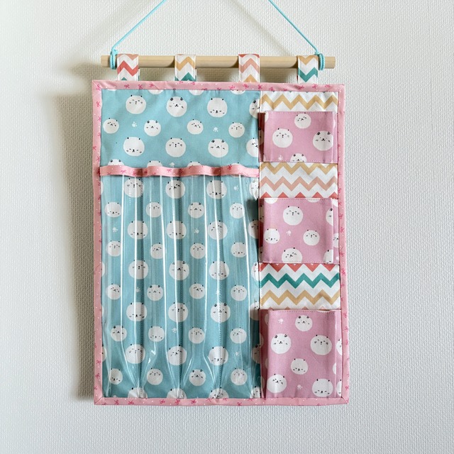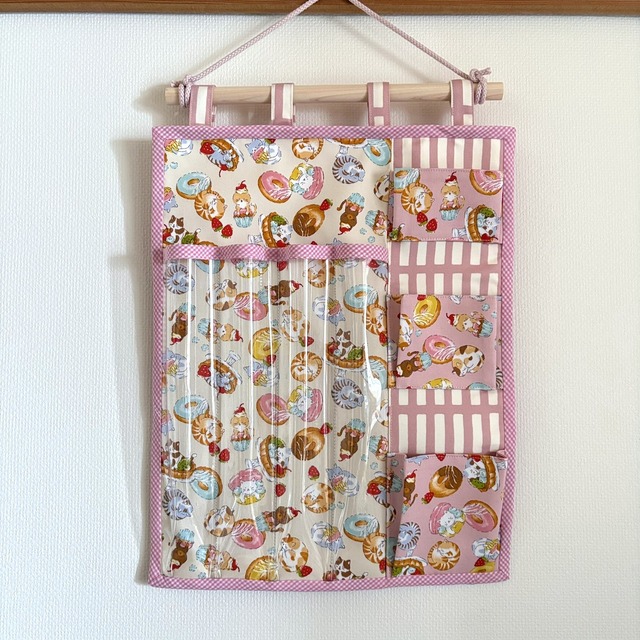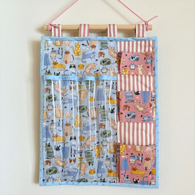 にゃんこのおもちゃを整理できるウォールポケットです。 絡まりやすい釣り竿型おもちゃも分けて収納できます。 左側には透明ビニールの長いおもちゃ用ポケットが4つ、 右側に小さなおもちゃをいれるポケットが3つ付いています。 ポケットの深さは下から10.5㎝、約8㎝、約6㎝。 まち付きポケットなので、ボールやねずちゃんなど、厚みのあるおもちゃも入ります。 5枚目の写真は同じサイズのウォールポケットを使った参考写真です。 サイズ:本体のみ縦40.5cm 横32cm