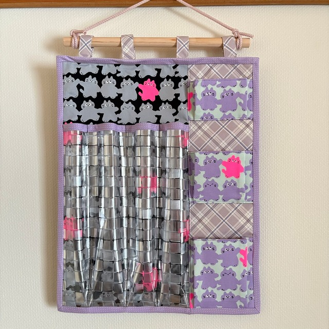 にゃんこのおもちゃを整理できるウォールポケットです。 絡まりやすい釣り竿型おもちゃも分けて収納できます。 左側にはモザイク柄ビニールの長いおもちゃ用ポケットが4つ、 右側に小さなおもちゃをいれるポケットが3つ付いています。 ポケットの深さは下から10.5㎝、約8㎝、約6㎝。 まち付きポケットなので、ボールやねずちゃんなど、厚みのあるおもちゃも入ります。 5枚目の写真は同じサイズのウォールポケットを使った参考写真です。 サイズ:本体のみ縦40.5cm 横32cm