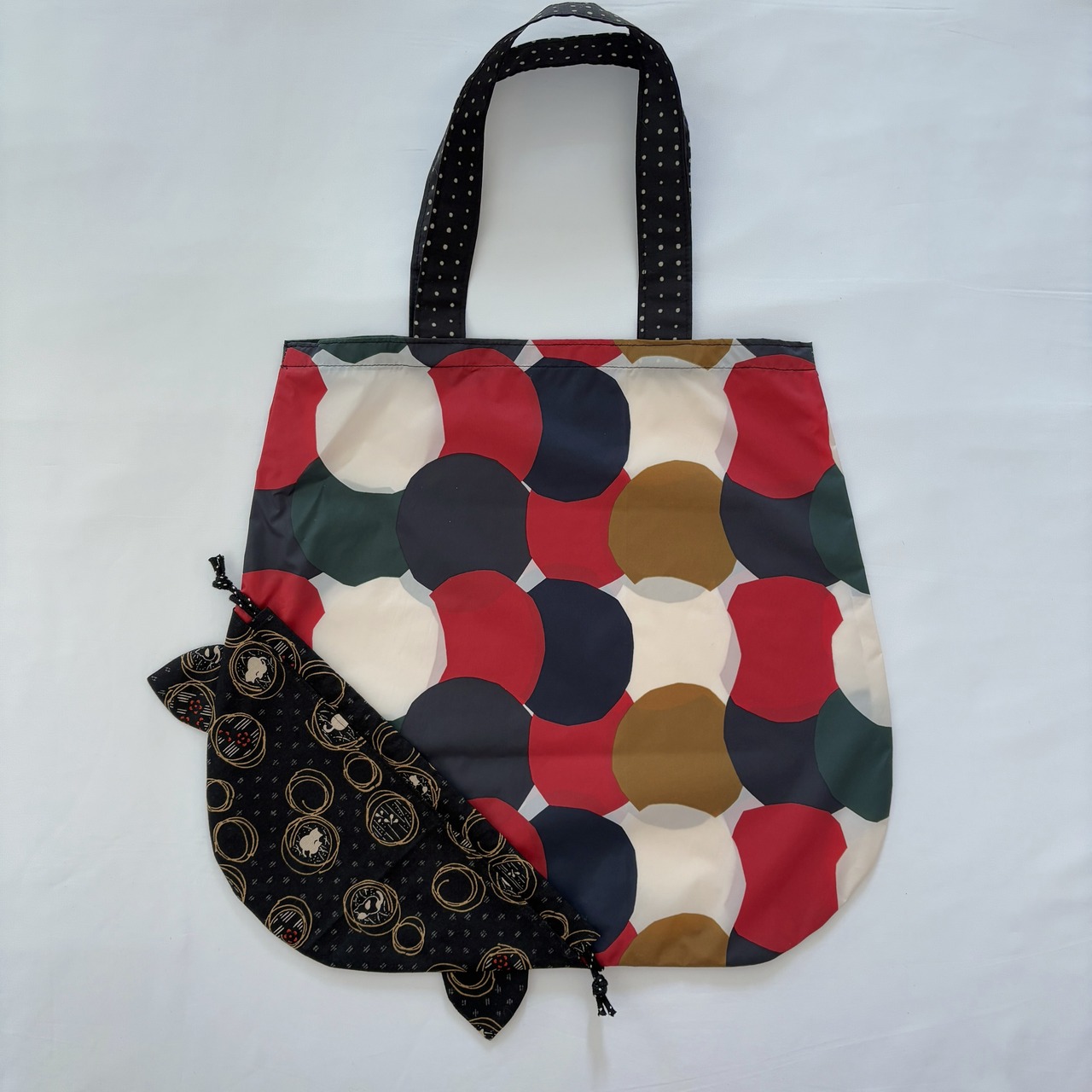 左下の猫柄布にバッグ本体を収納して巾着紐を絞るとネコ型になります。
