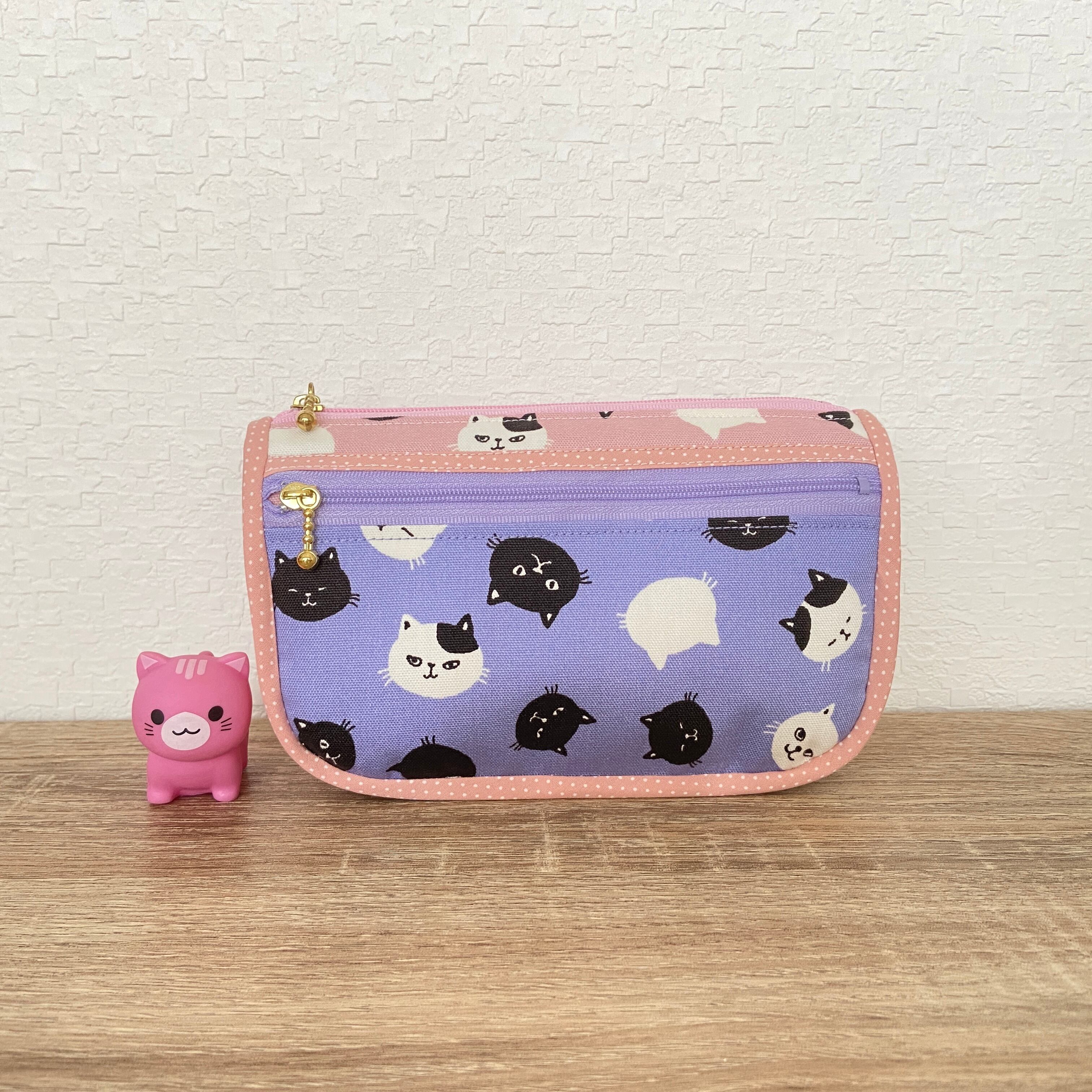前面に色違いの猫柄布を使ったファスナーポケットがついていますので