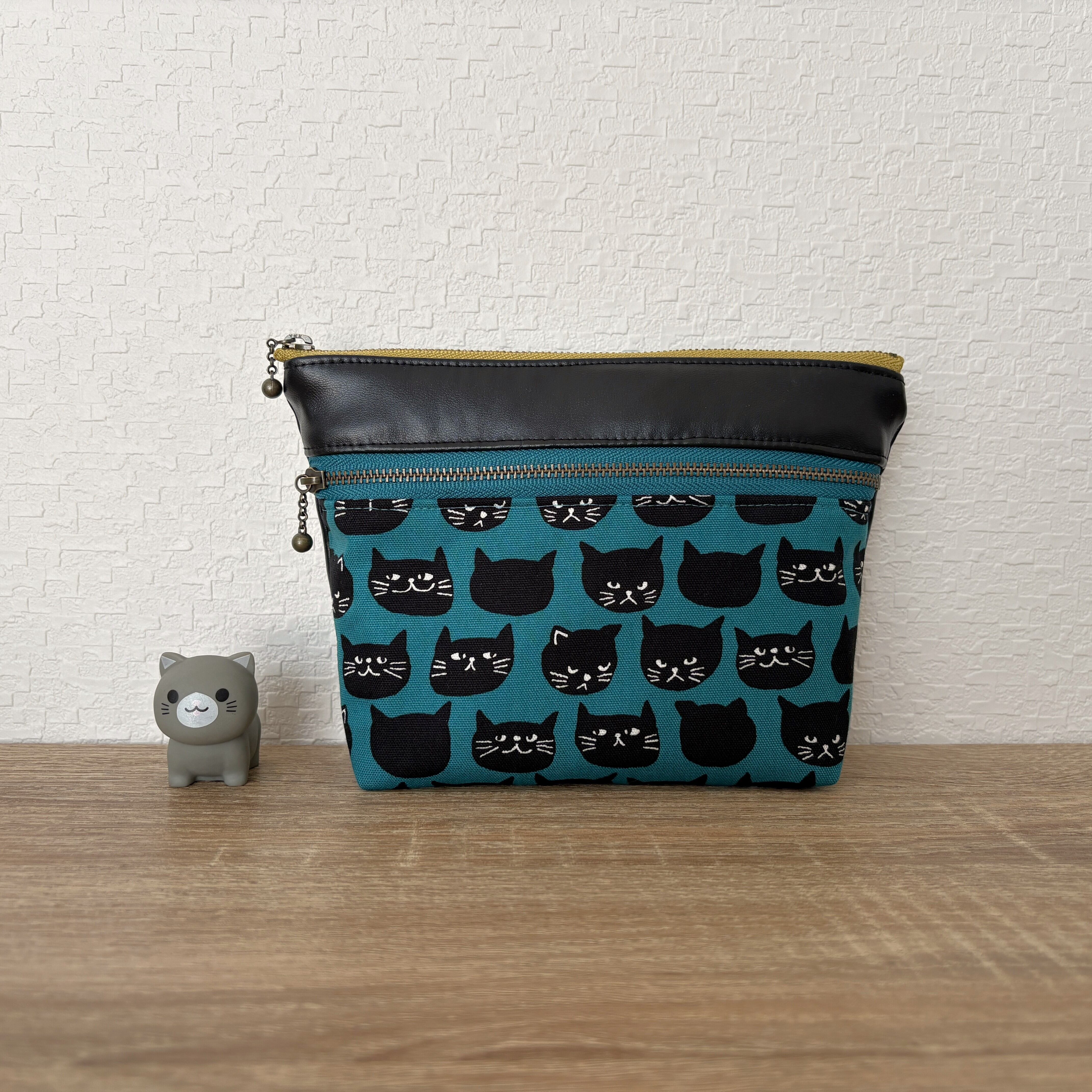 猫柄生地と黒のソフト合皮生地を組み合わせたポーチです。