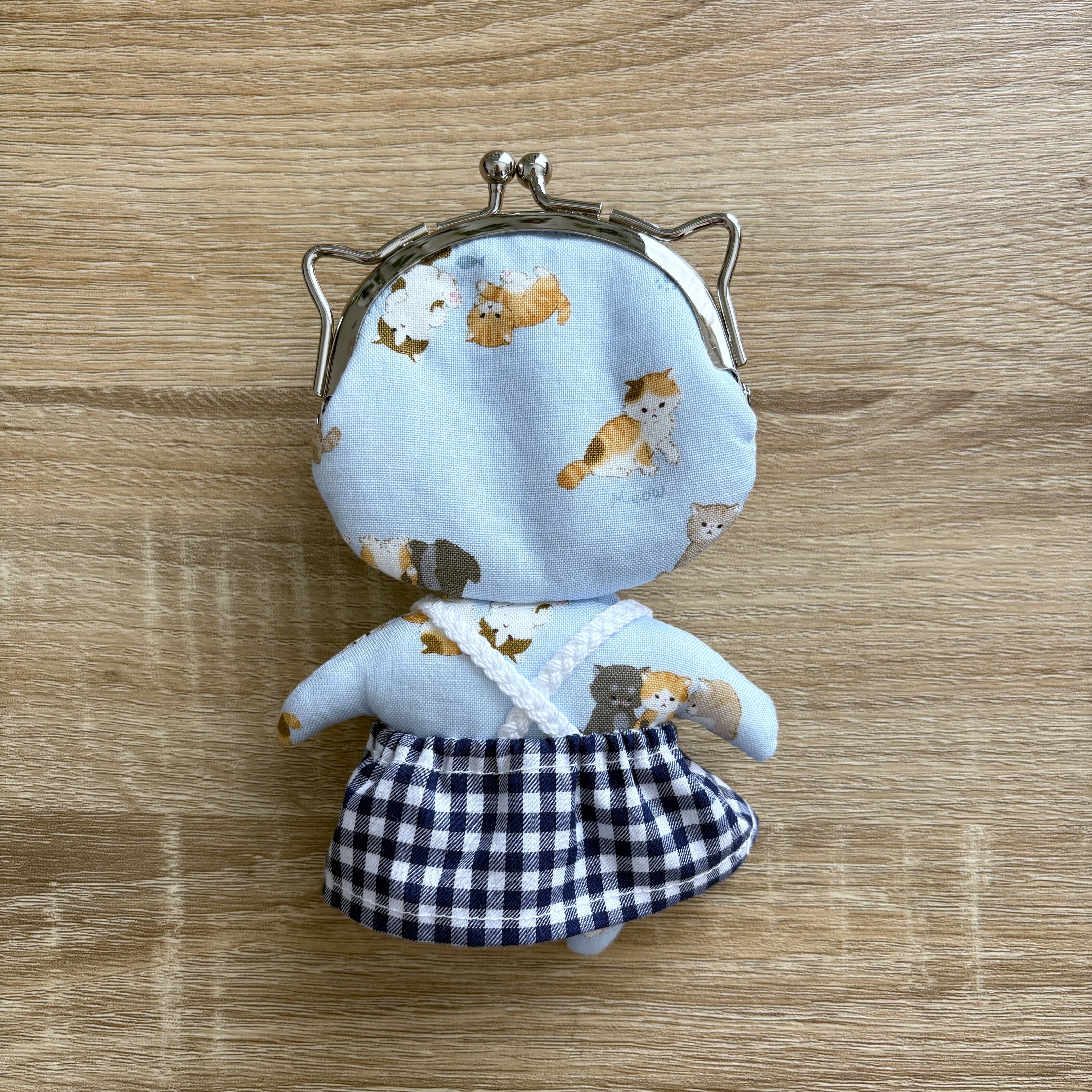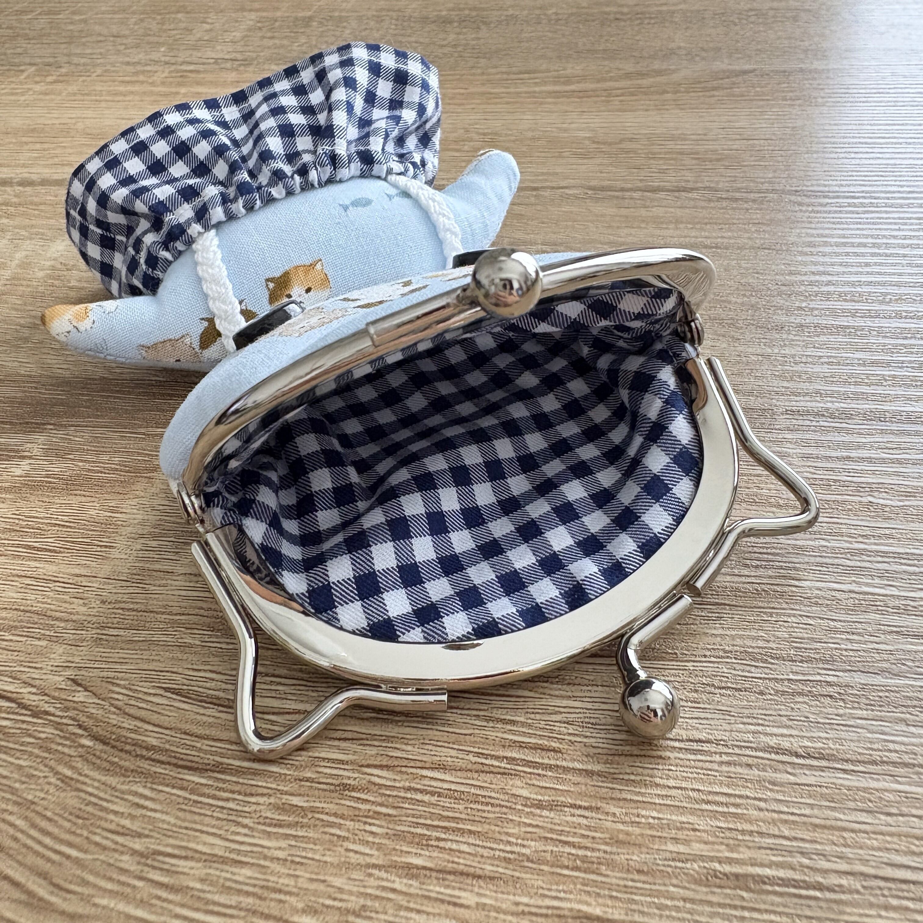三角のカンが付いたがま口を使ったネコ型ポーチです。