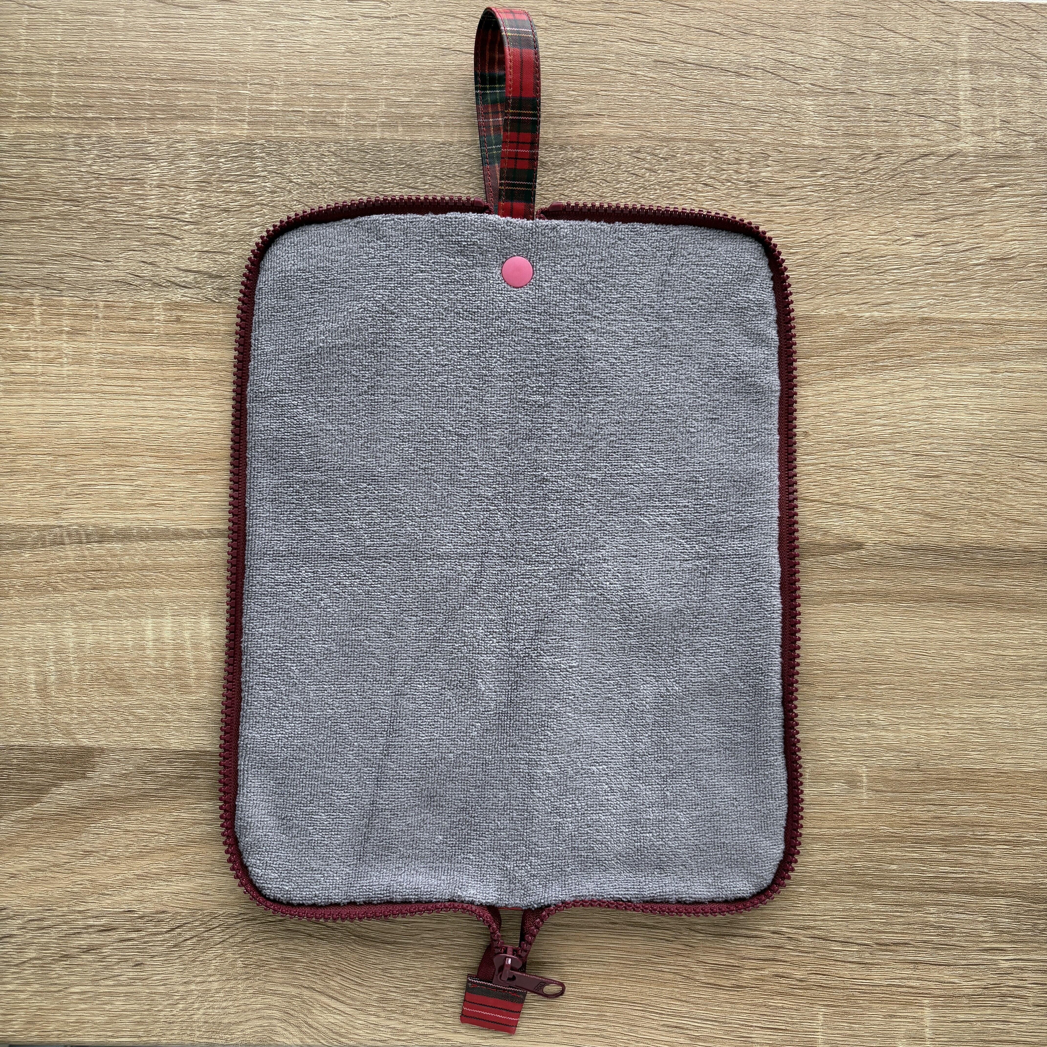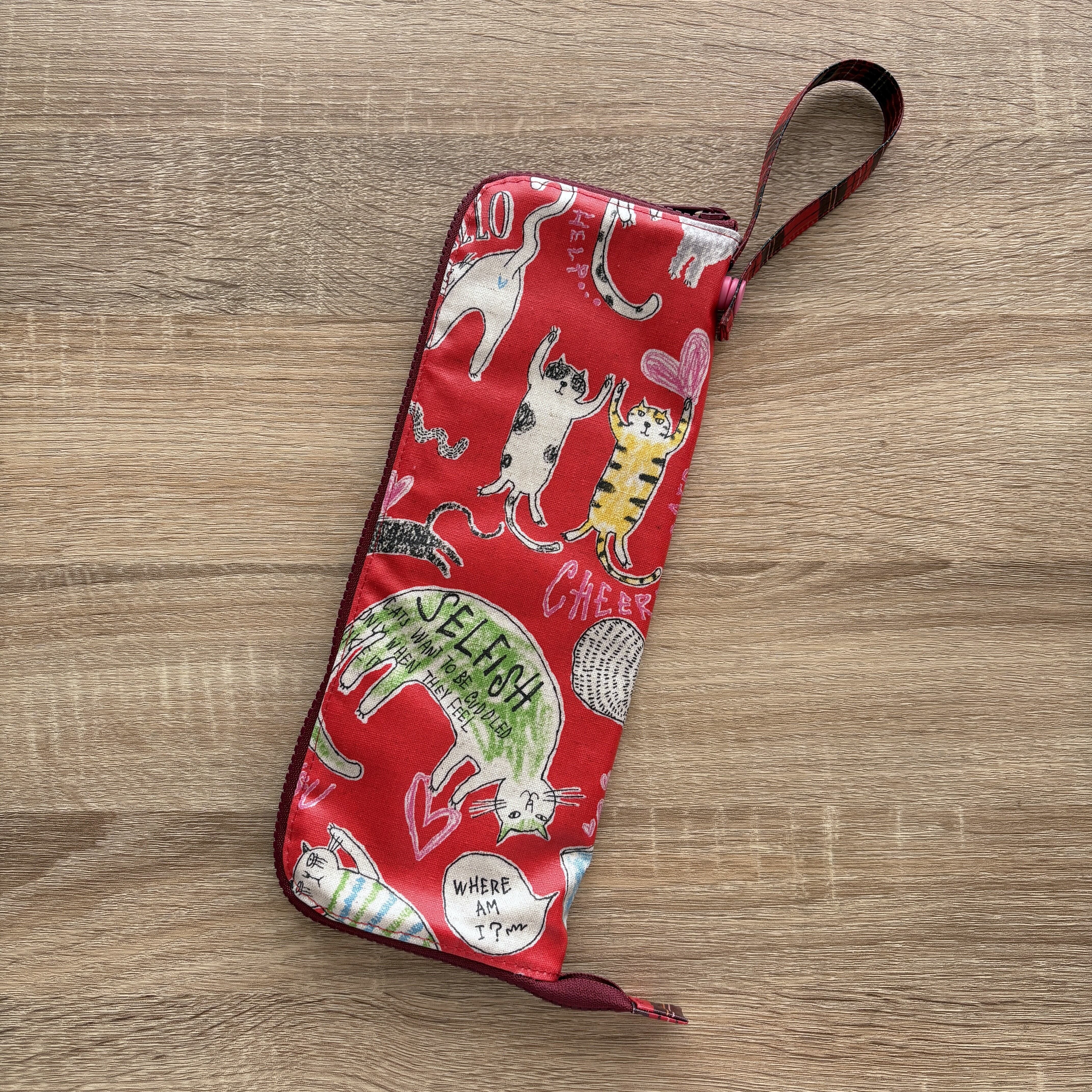 外側は猫柄ラミネート生地で、内側は吸水性の高いマイクロファイバー生地を