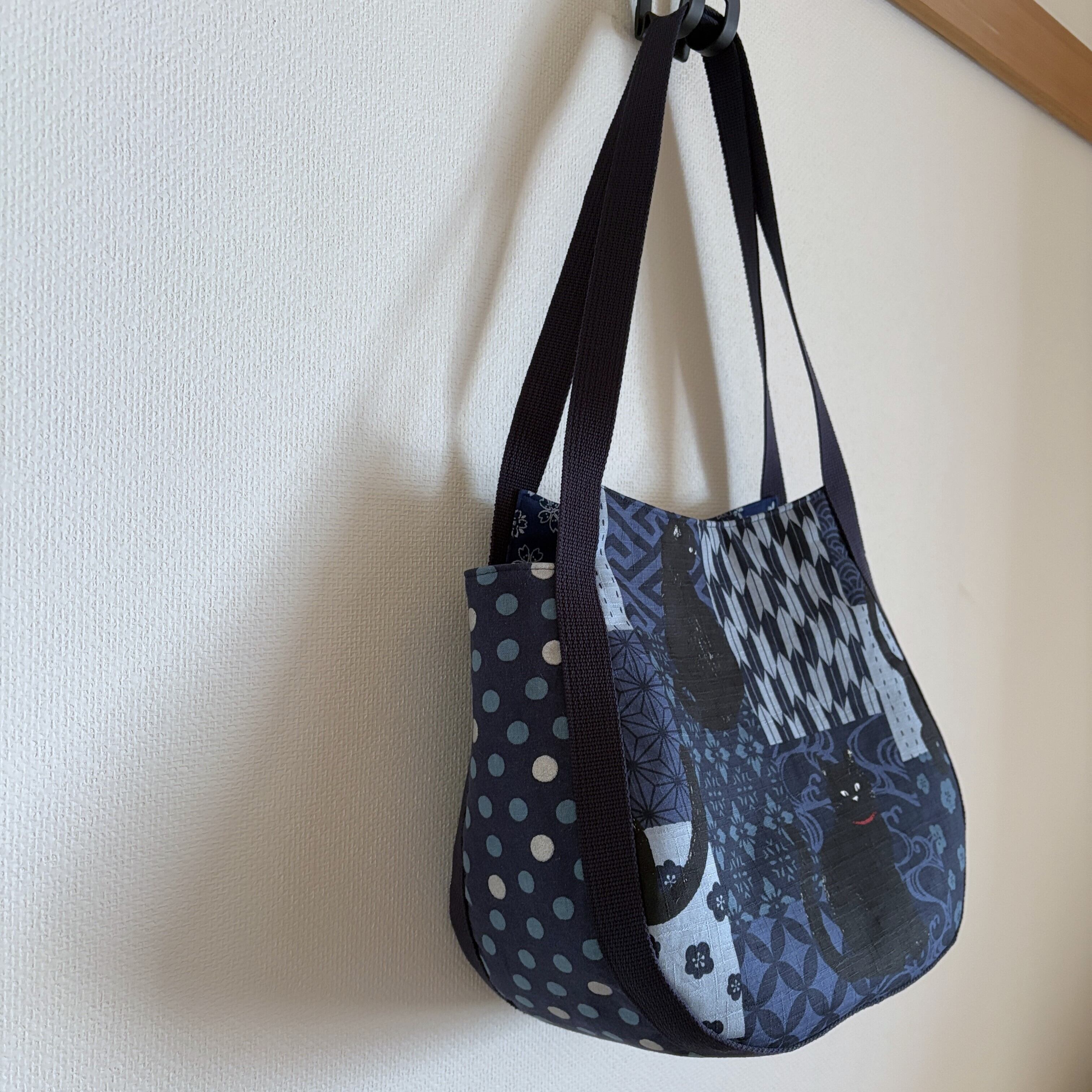 肩から提げたままでも中身の出し入れができるよう長めの持ち手を付けました。