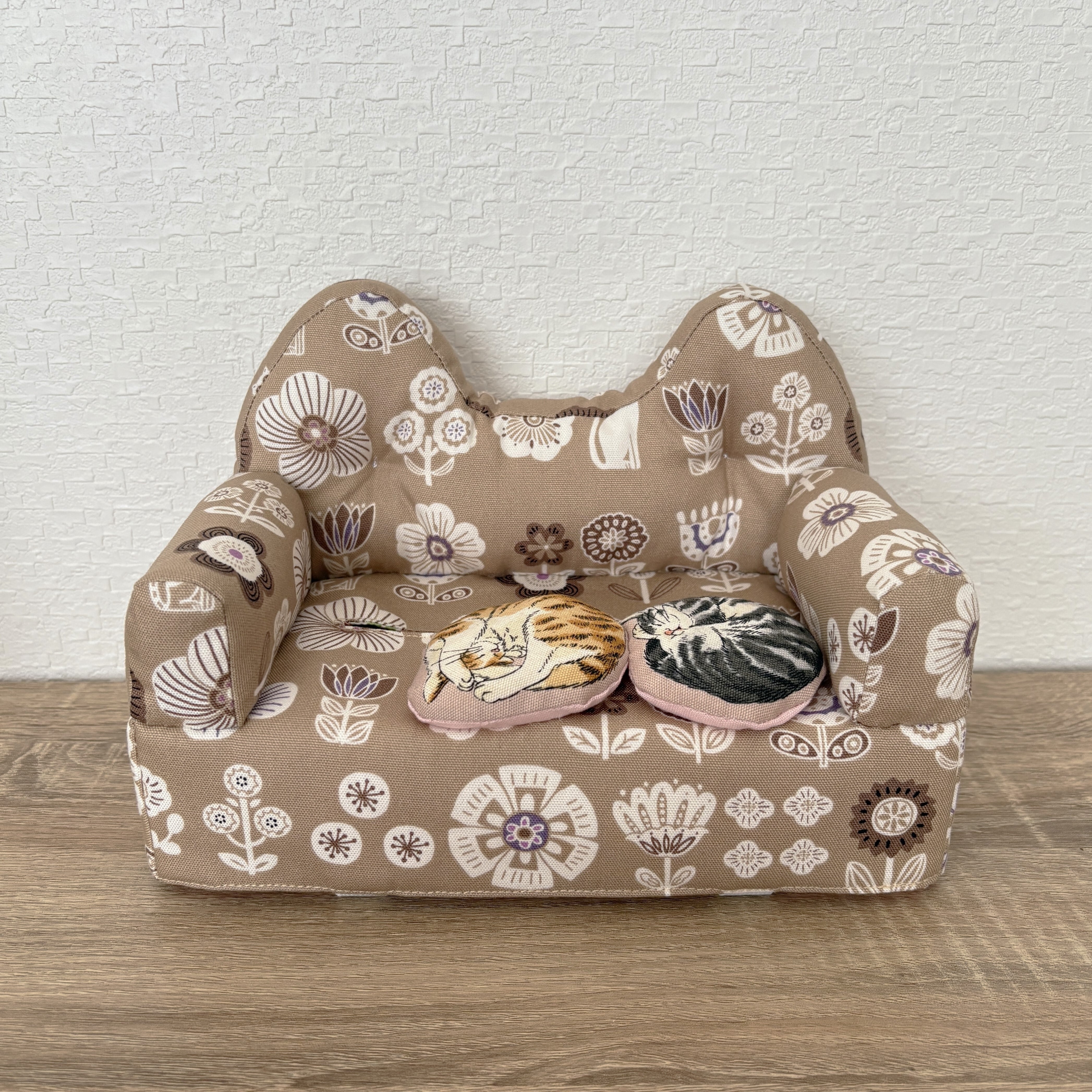 猫柄生地を使用し、背もたれもにゃんこ型になっています。