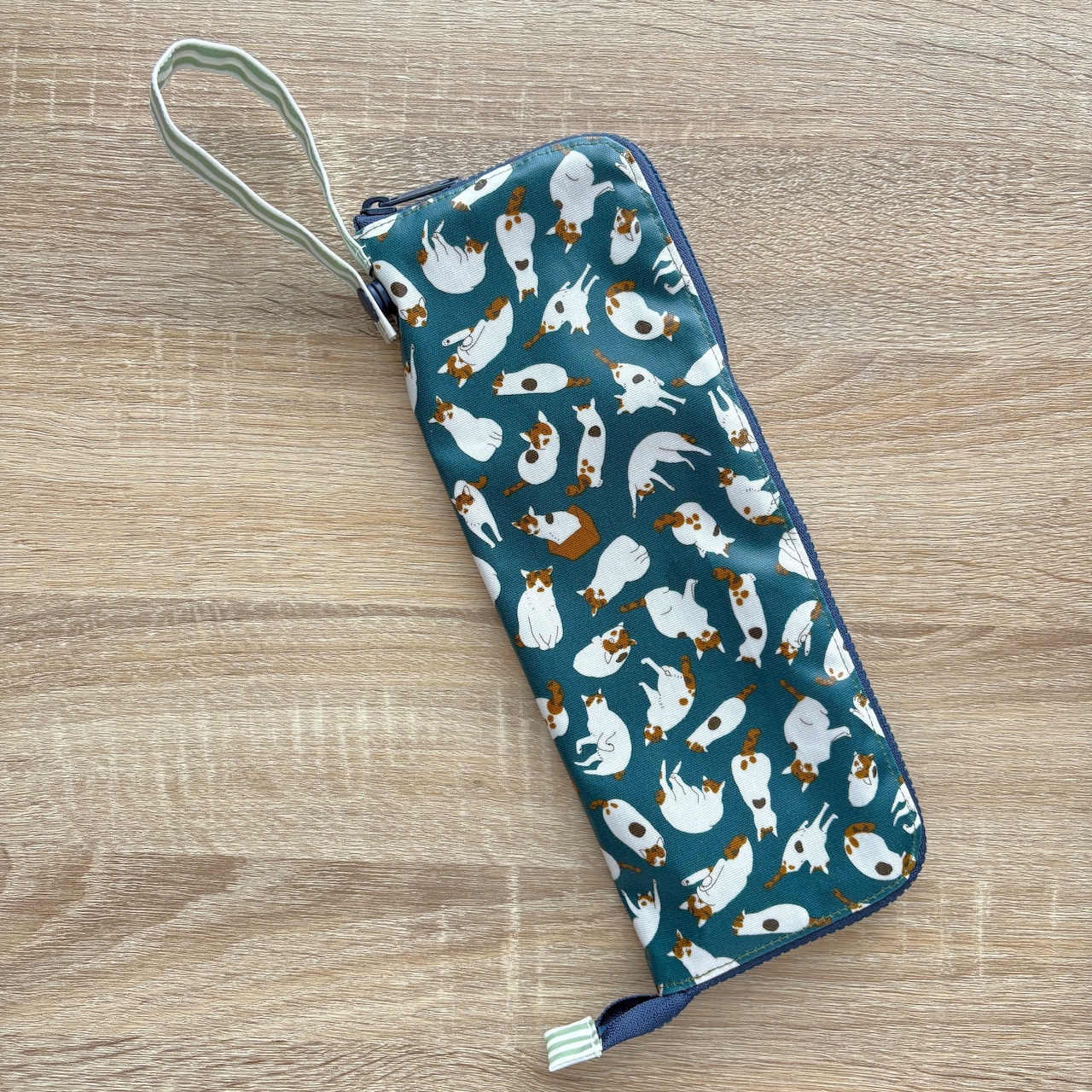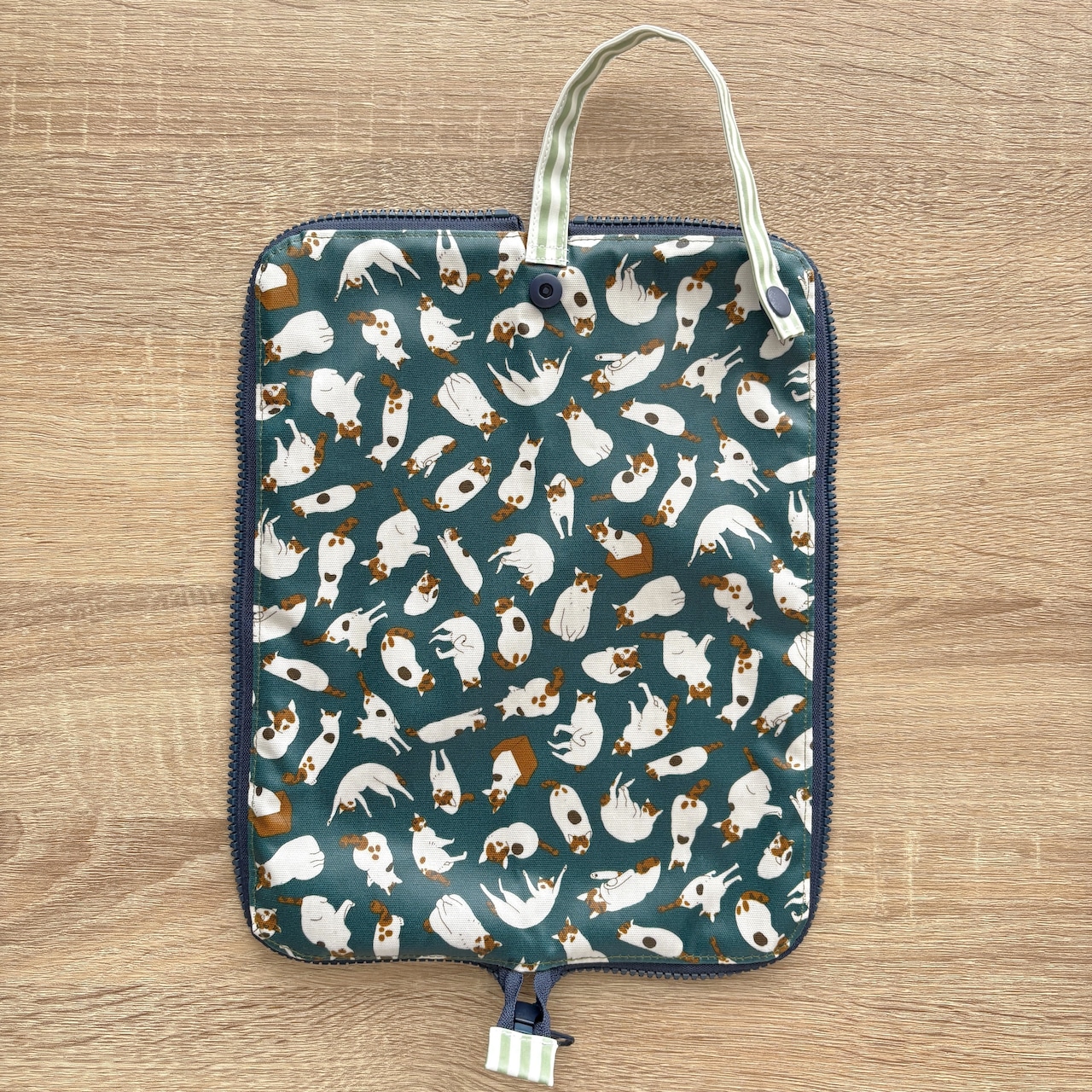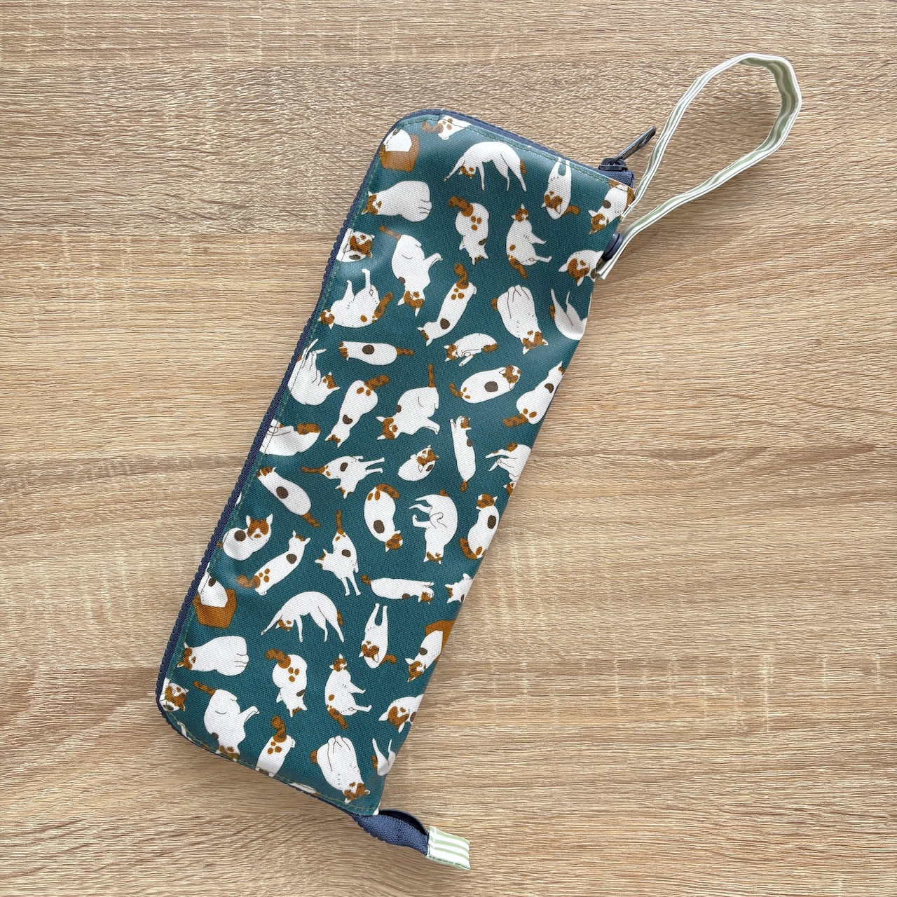 外側は猫柄ラミネート生地で、内側は吸水性の高いマイクロファイバー生地を