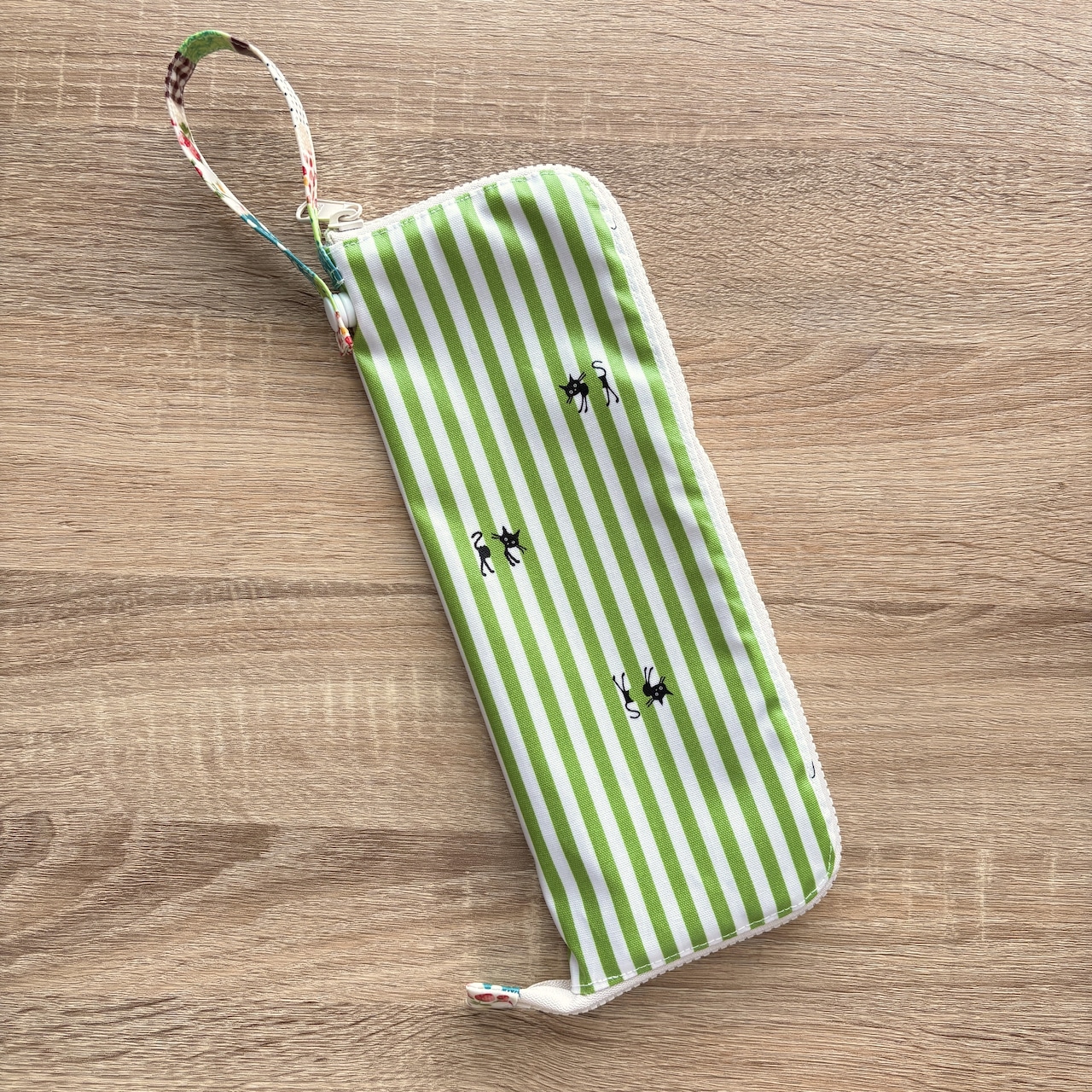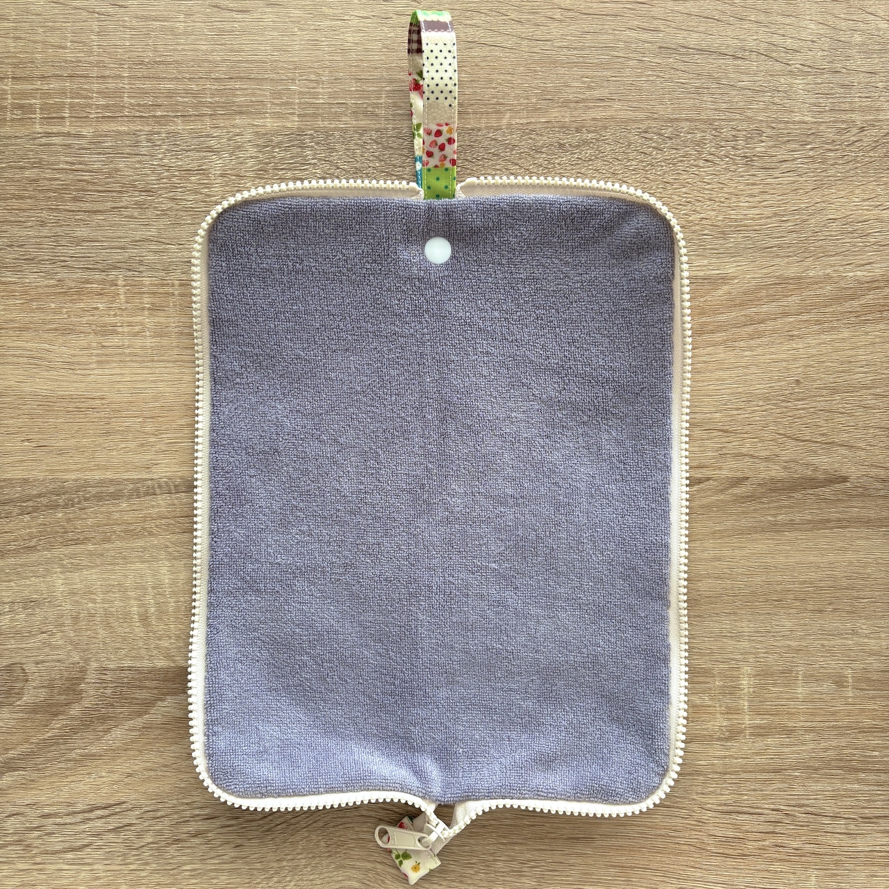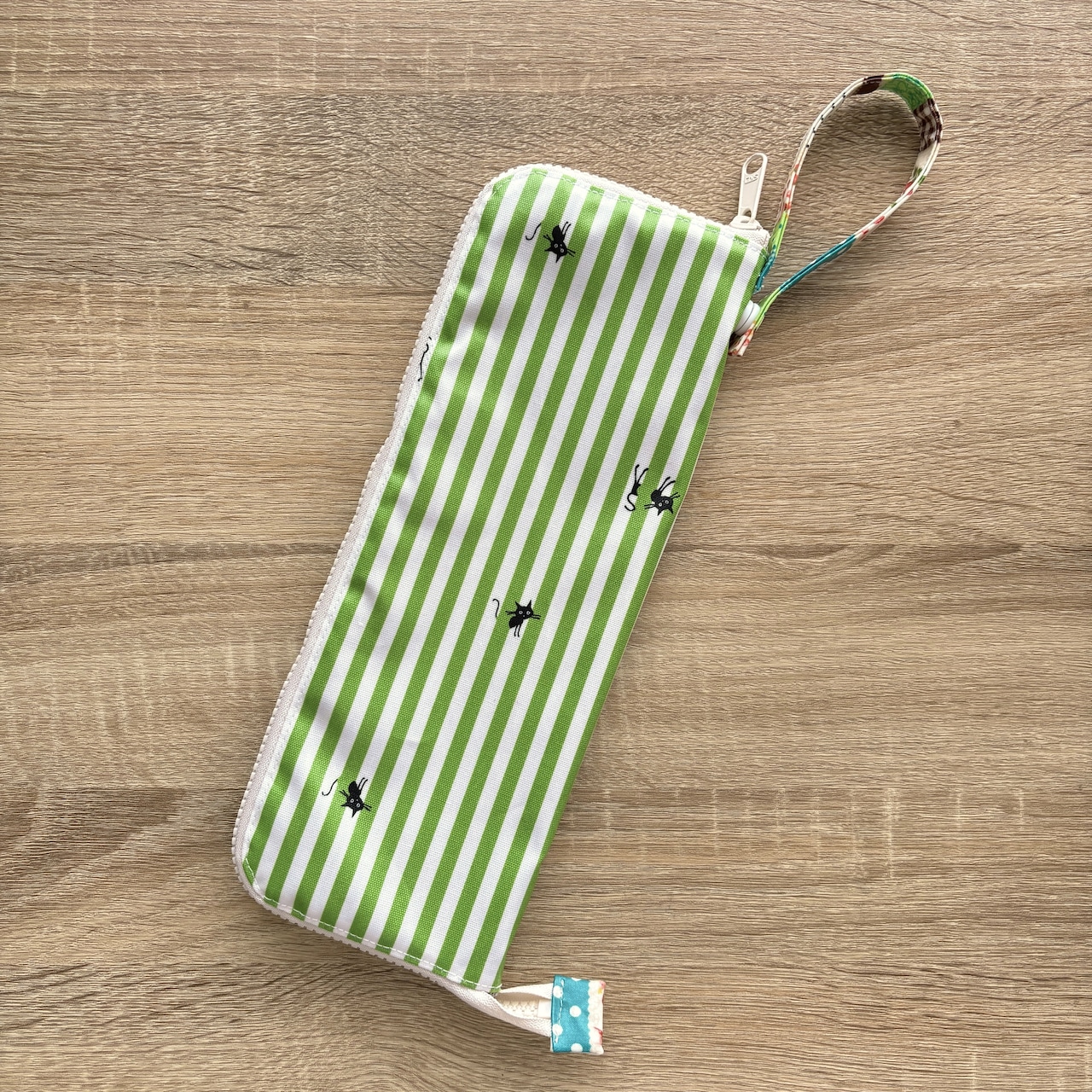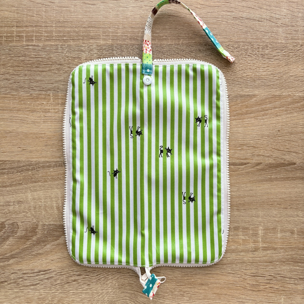 外側は猫柄ラミネート生地で、内側は吸水性の高いマイクロファイバー生地を
