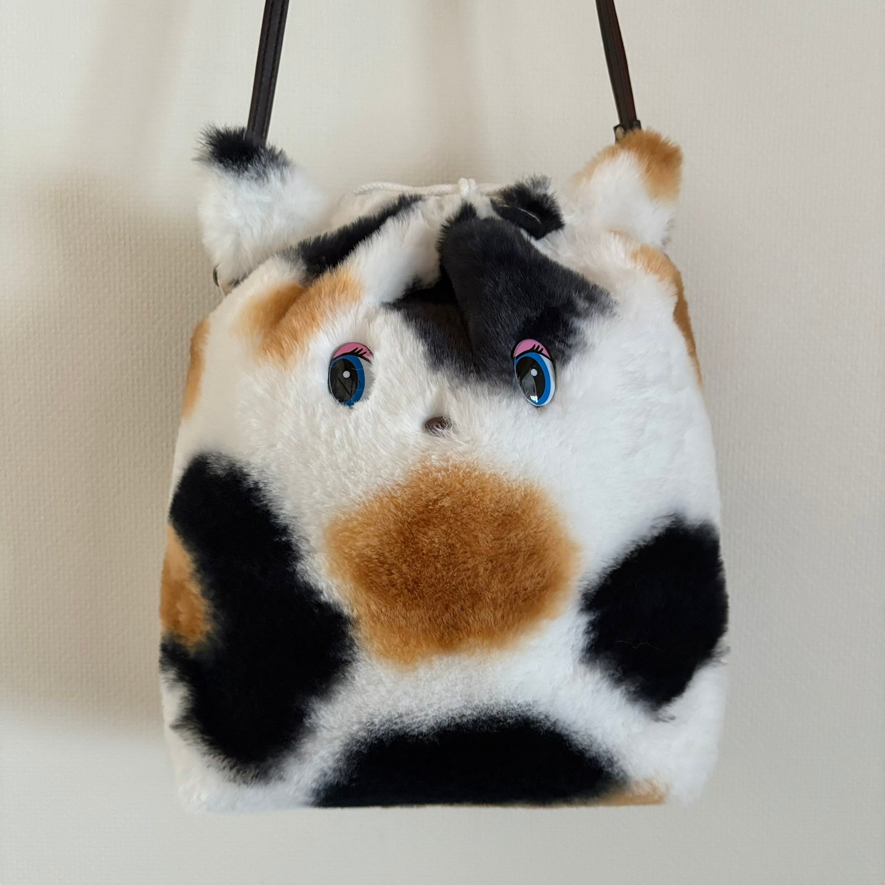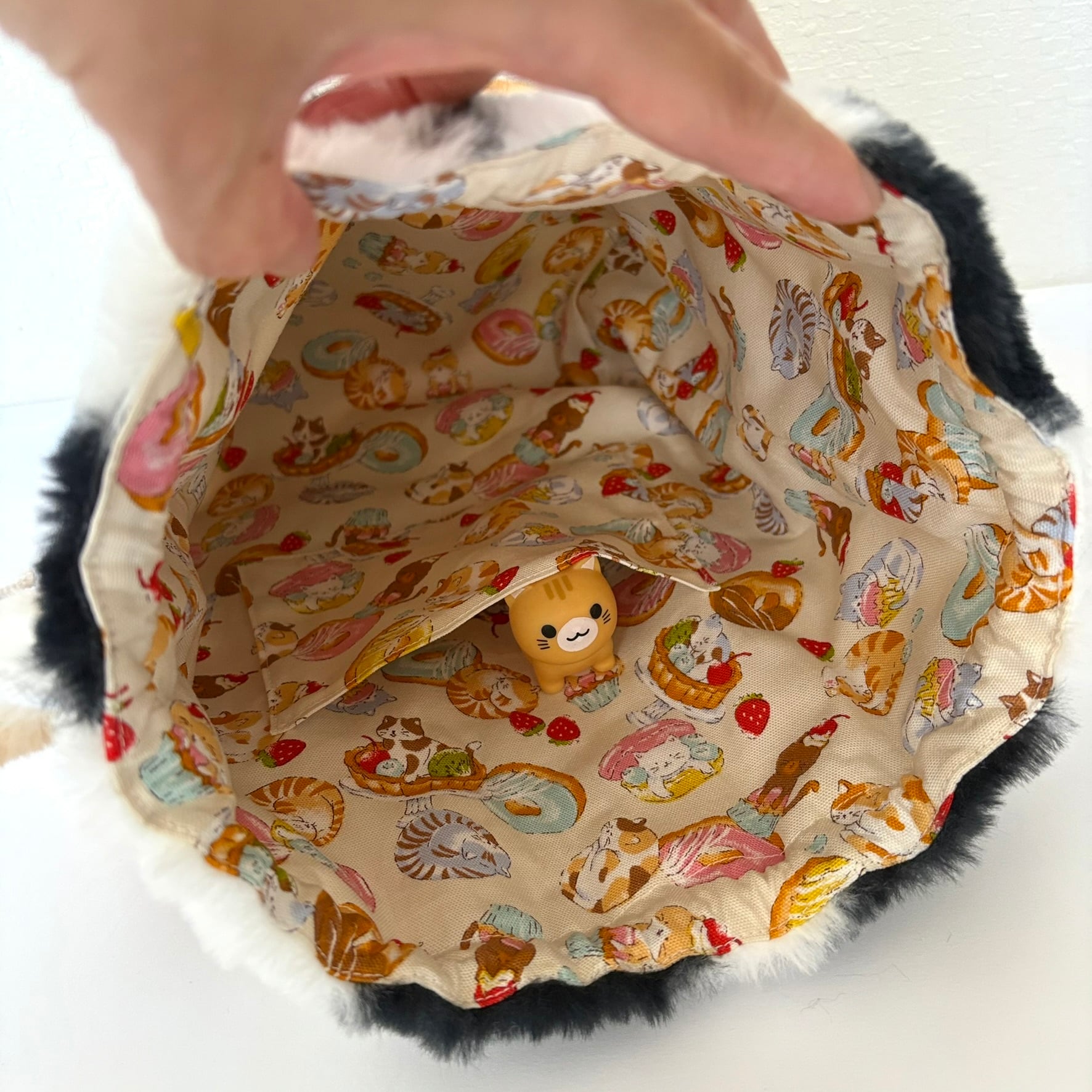 巾着をぎゅっと絞るとかわいいにゃんこが現れます。