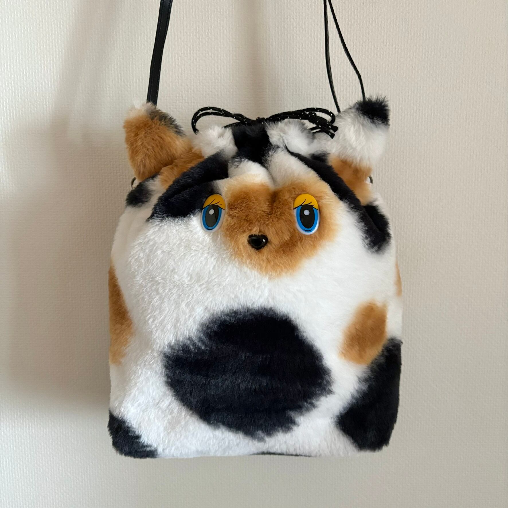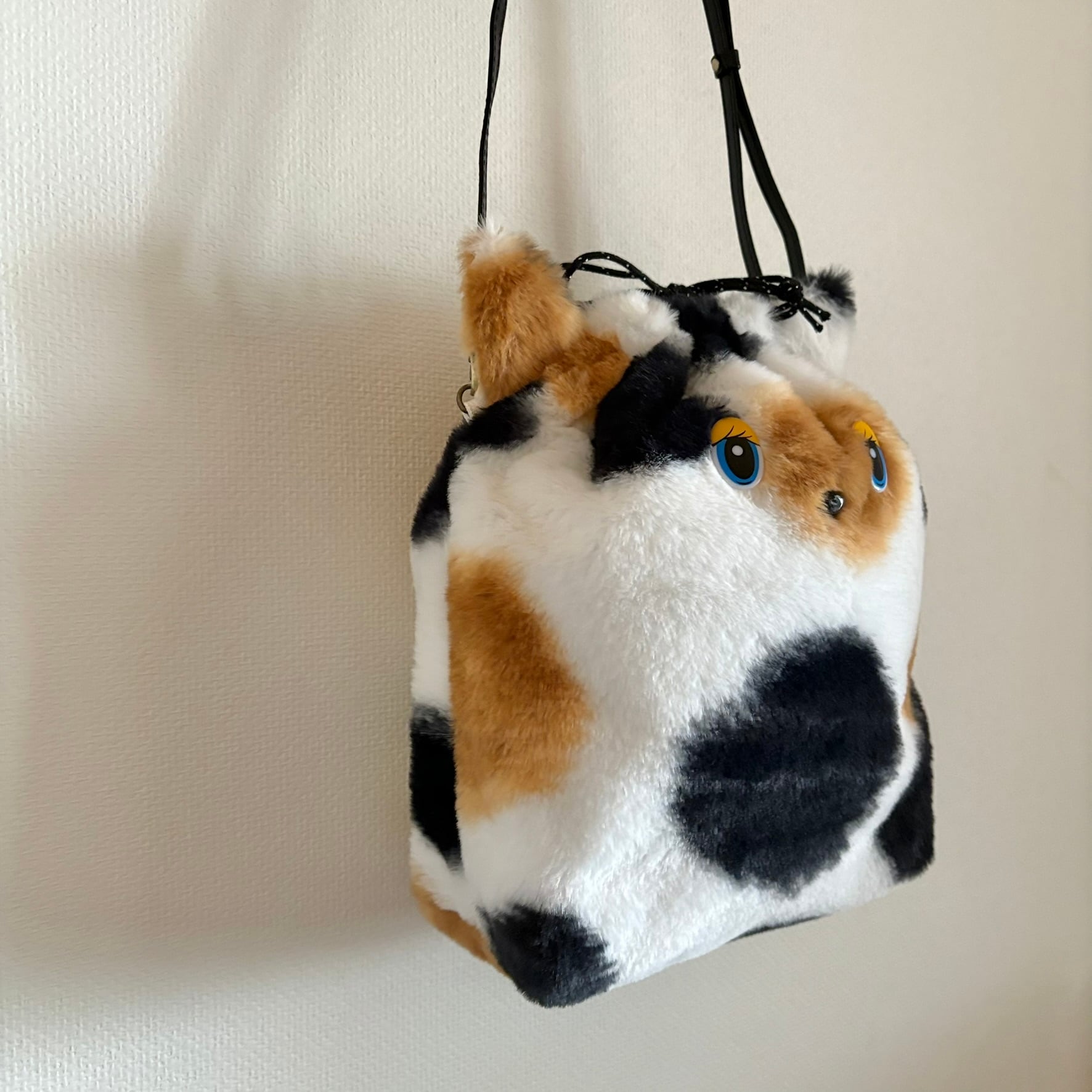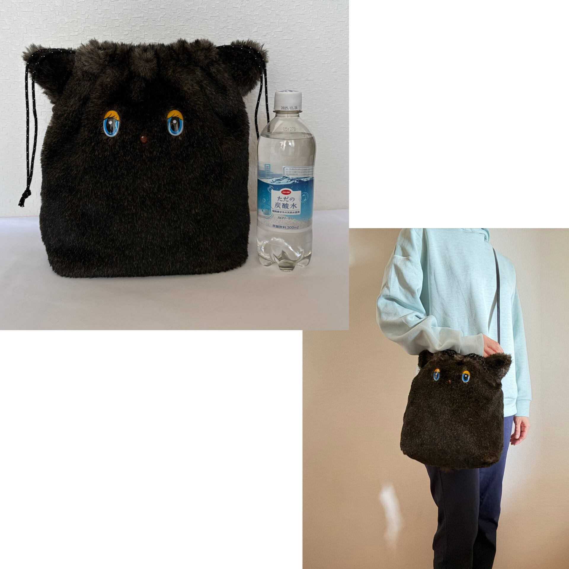 巾着をぎゅっと絞るとかわいいにゃんこが現れます。