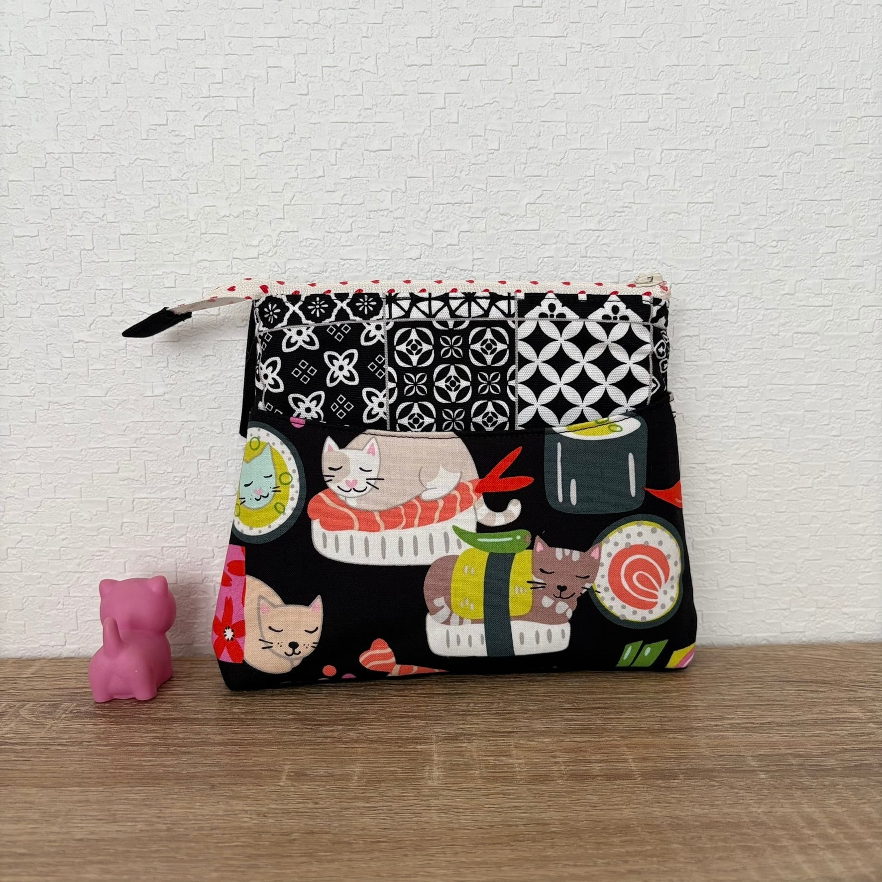 ファスナーポーチの前後にポケットを付けた、お部屋が3つあるポーチです。