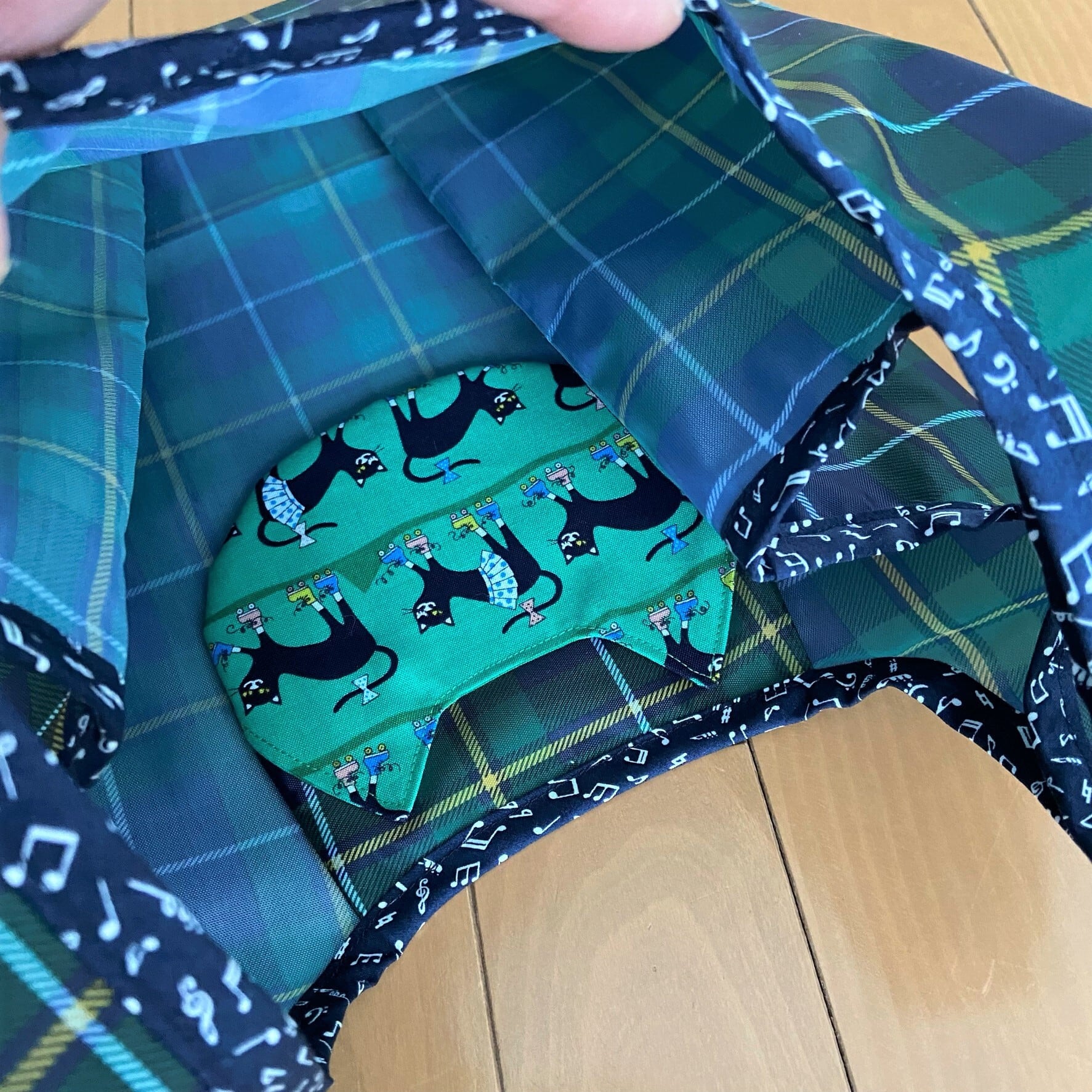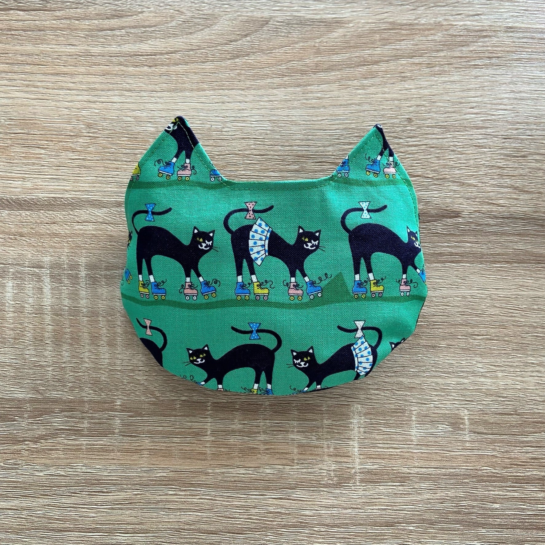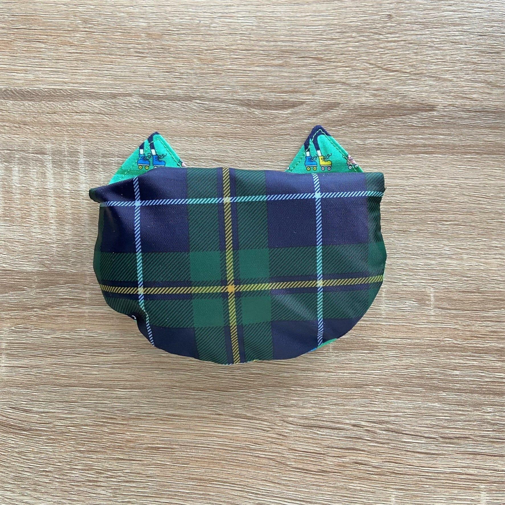 内側に付けた猫型ポケットが本体の収納袋になります。