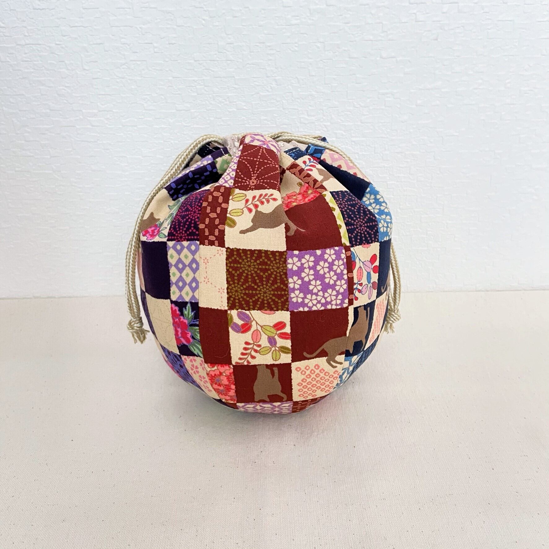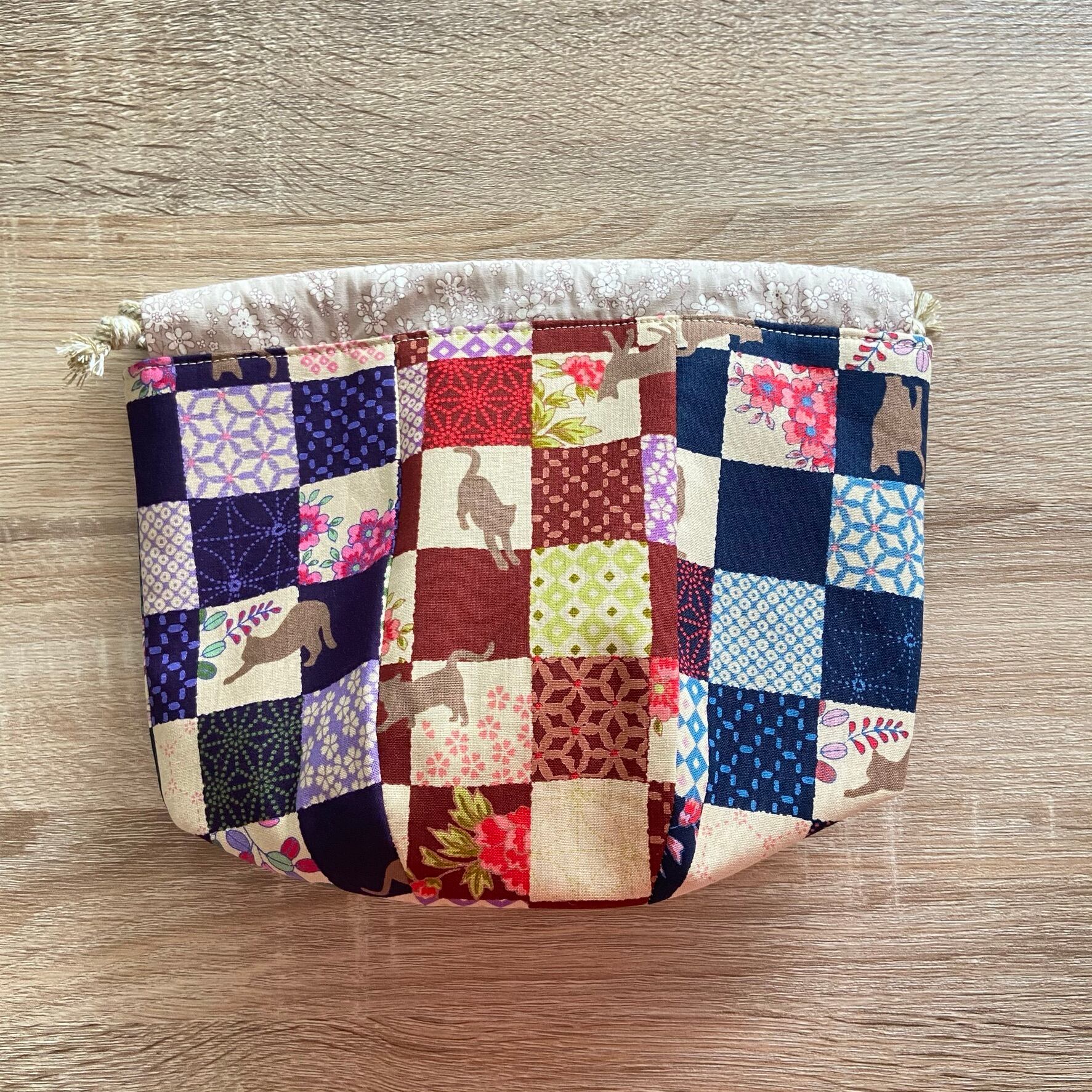 色違いの猫柄布を6枚はぎあわせて作ったきんちゃく袋です。