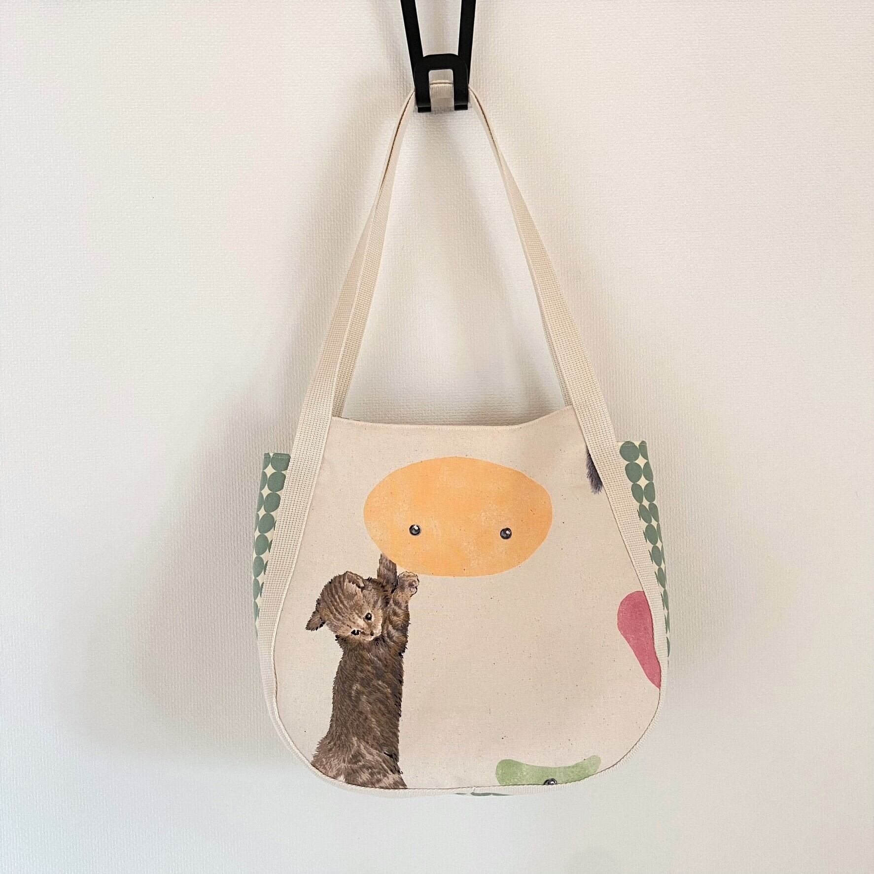 肩から提げたままでも中身の出し入れができるよう長めの持ち手を付けました。