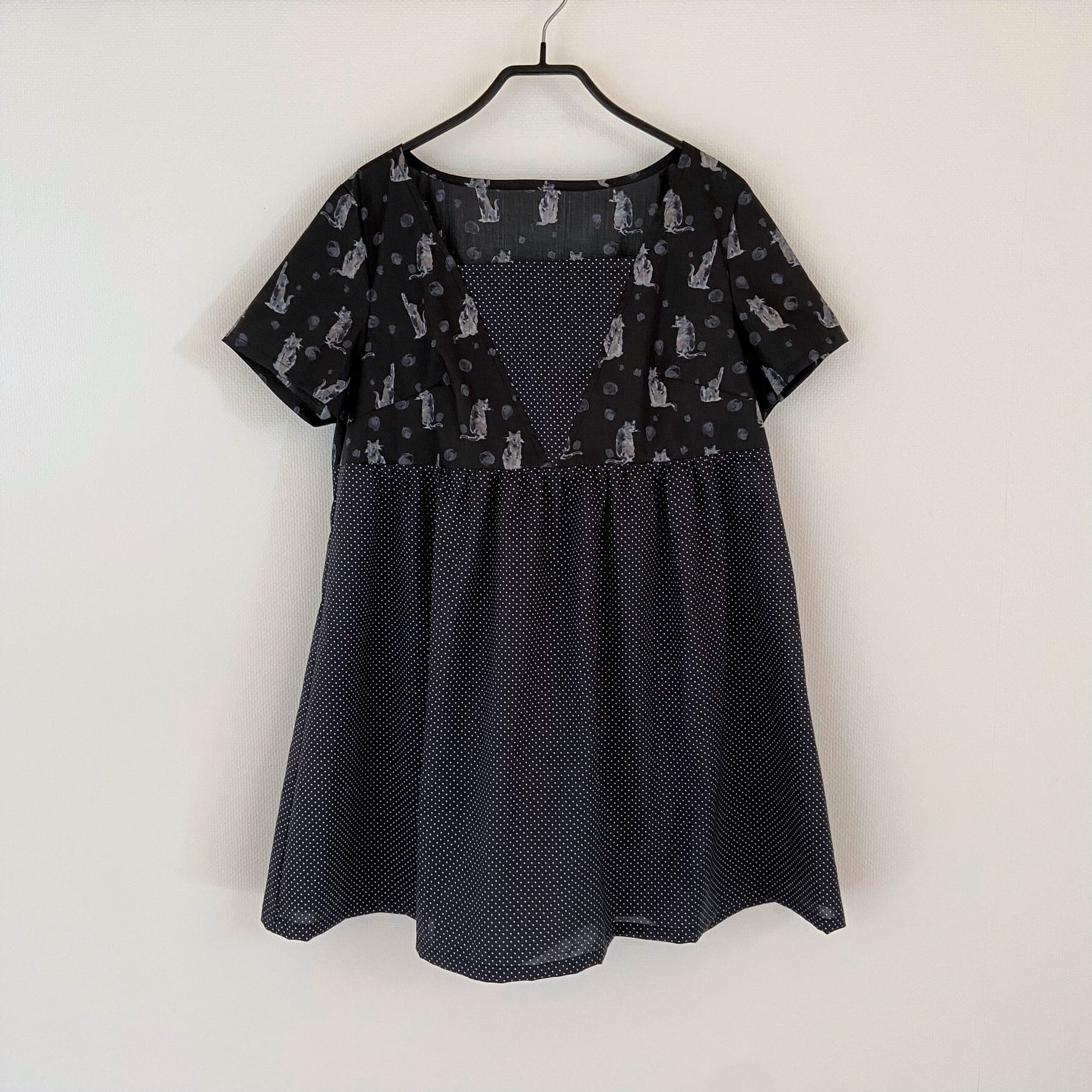 V開き+胸当てのデザインに猫柄を取り入れました。