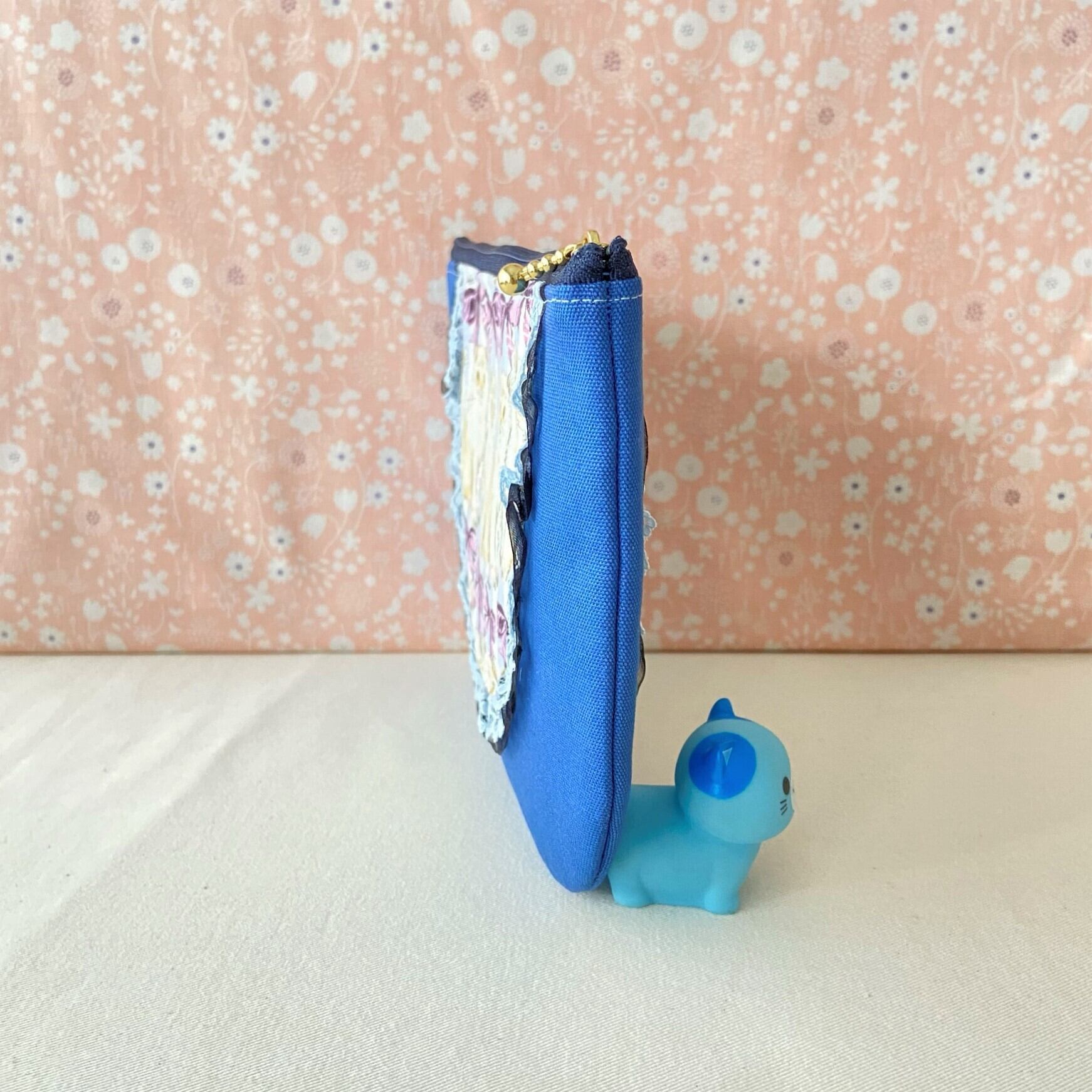 ポーチ中央に猫柄の飾り布を配置し、周りにはフリルテープの縁取りを付けました。