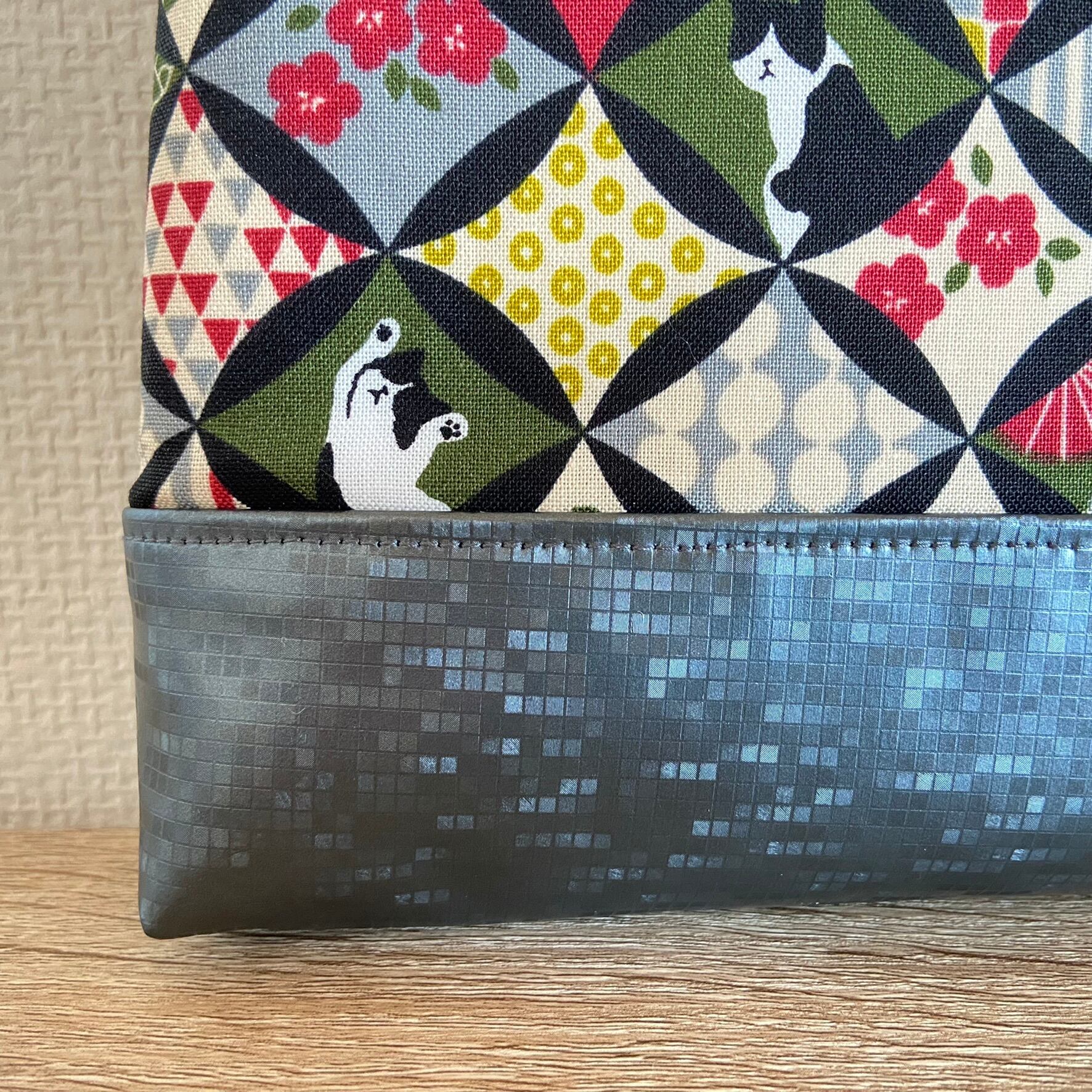 和風の猫柄布を使い、切り替えを入れて下の部分には合皮生地を合わせました。