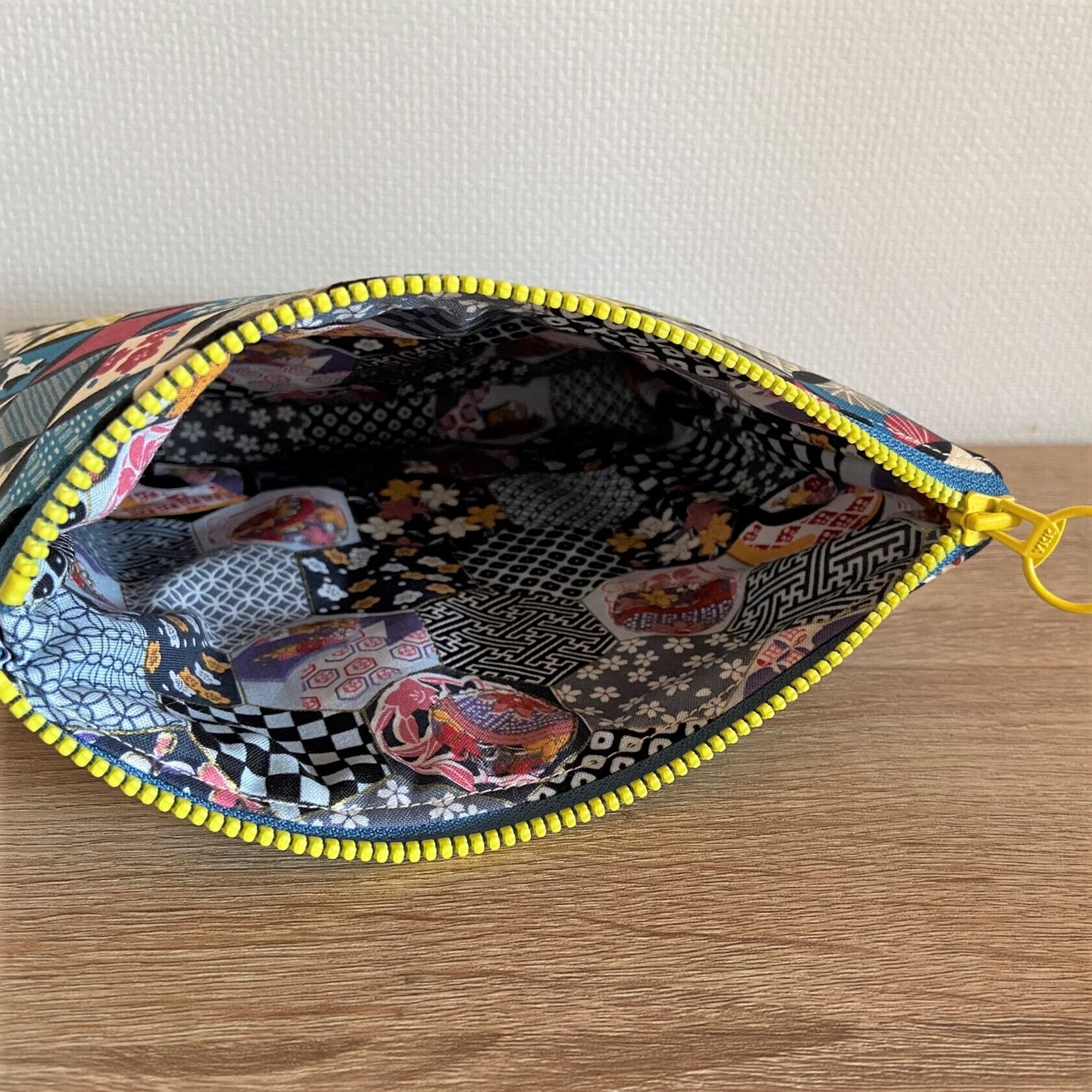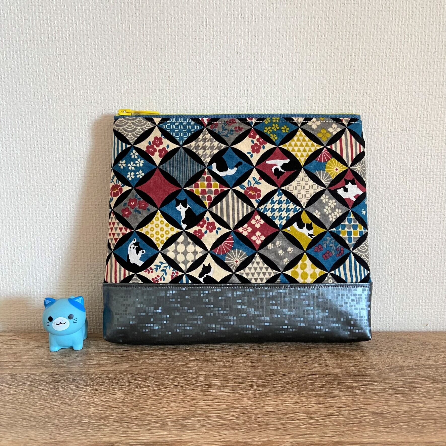 和風の猫柄布を使い、切り替えを入れて下の部分には合皮生地を合わせました。