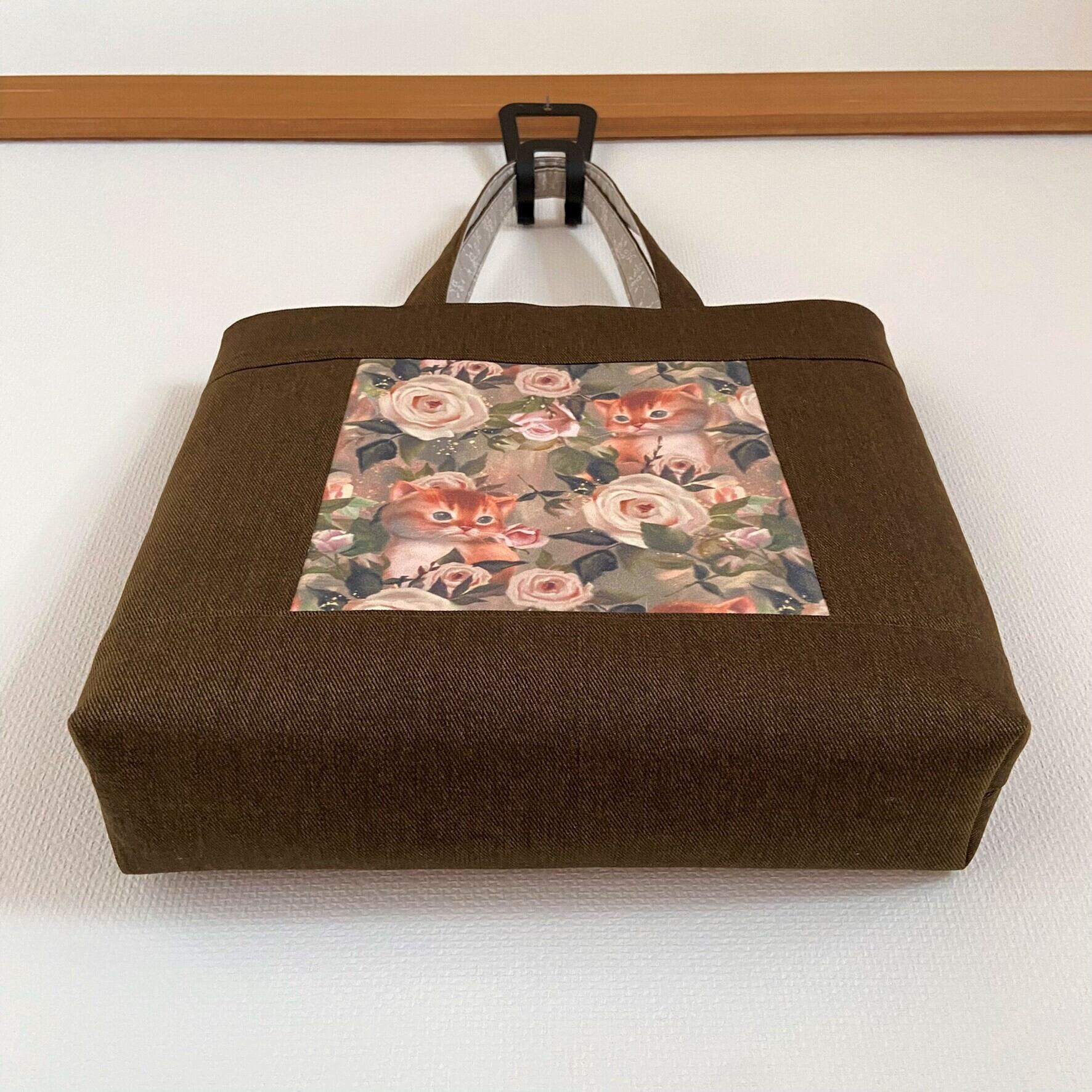 猫柄布を絵画に見立てて、額縁に飾ったようなバッグにしました。
