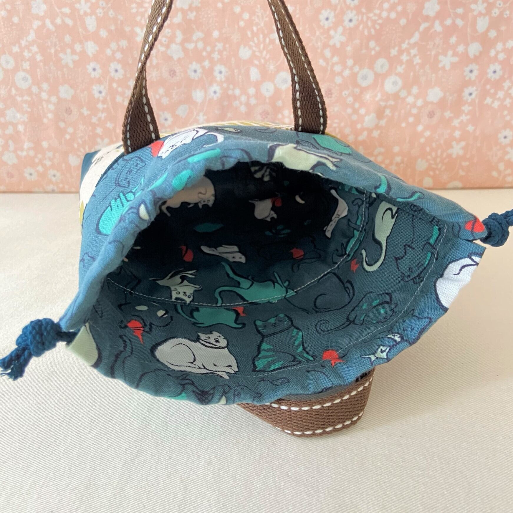 巾着布の部分にも猫柄布を使い、2種類の猫柄を組み合わせました。