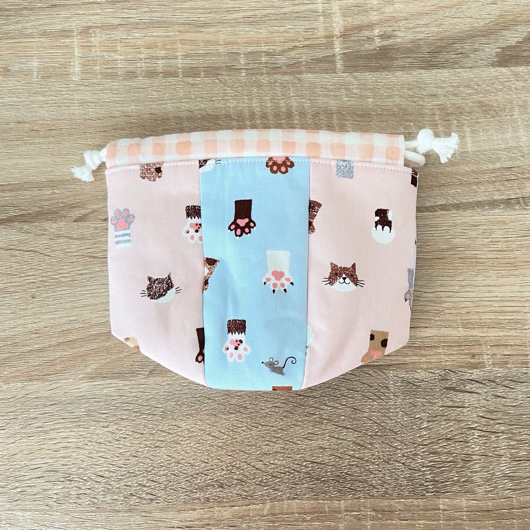 色違いの猫柄布を6枚はぎあわせて作ったきんちゃく袋です。