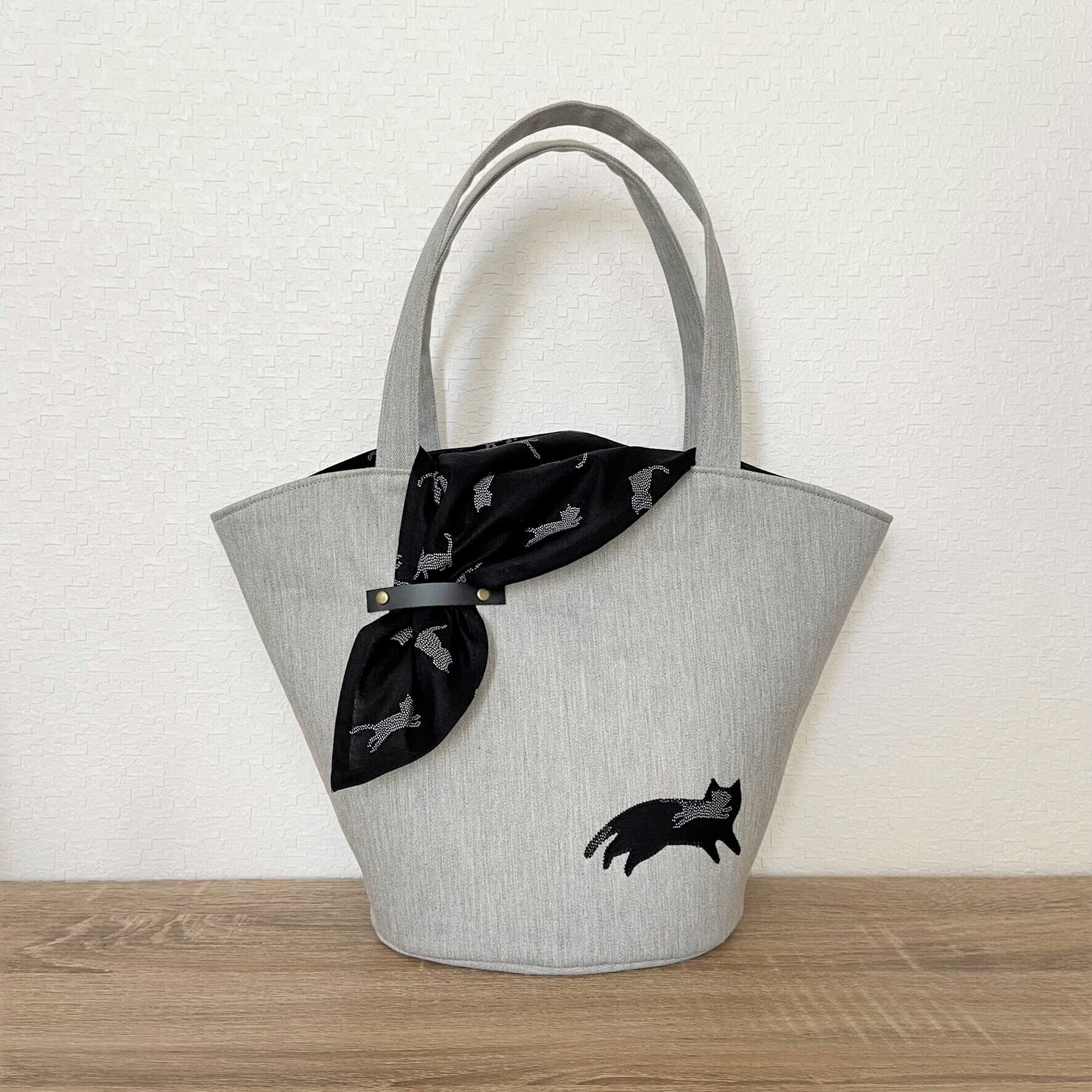 バッグ本体右下に同じ猫柄生地を使用した猫型アップリケをつけました。