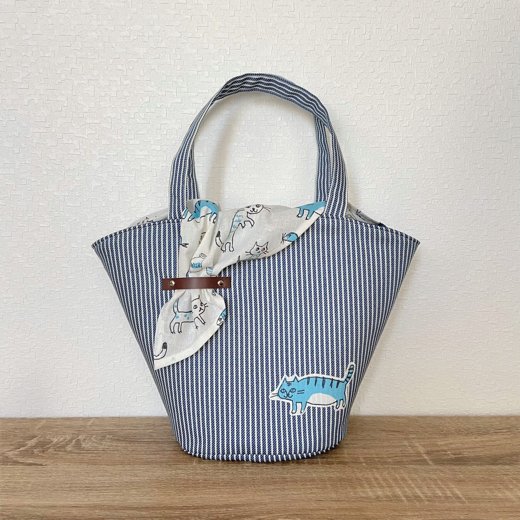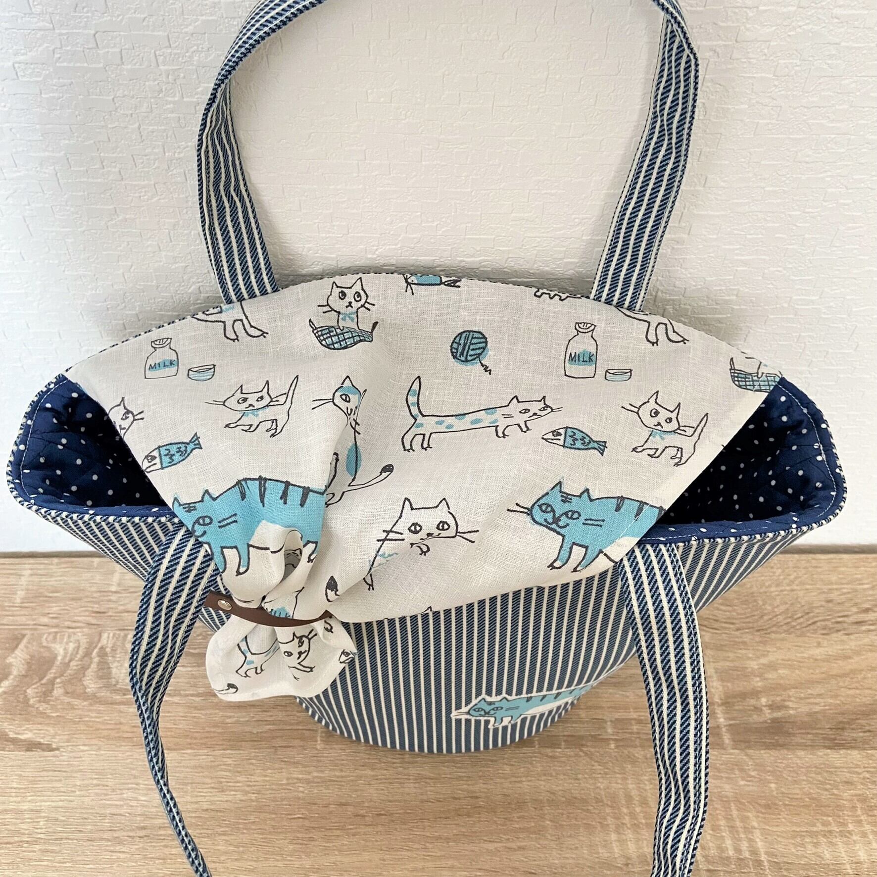 バッグ本体右下に同じ猫柄生地を使用した猫型アップリケをつけました。