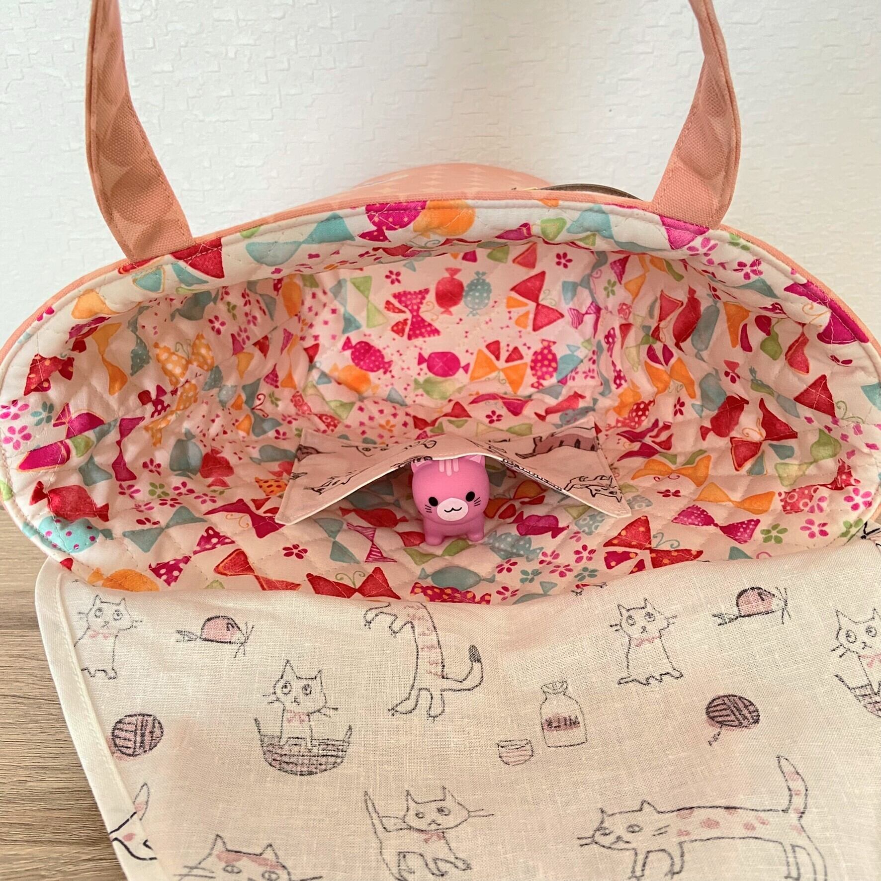 バッグ本体右下に同じ猫柄生地を使用した猫型アップリケをつけました。