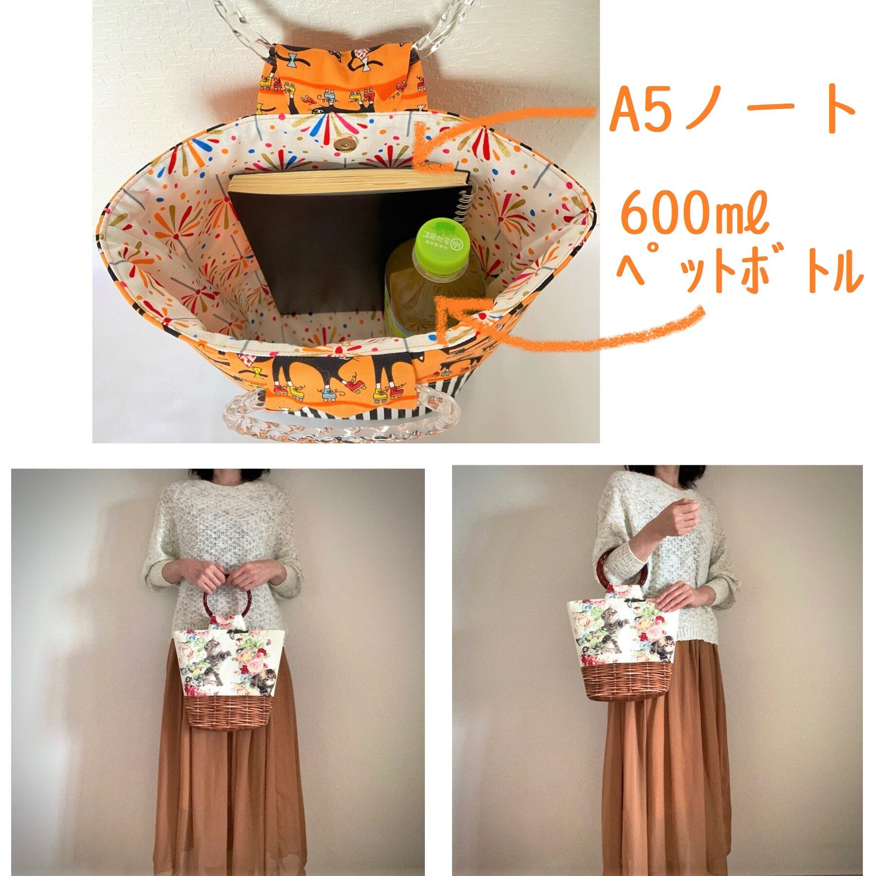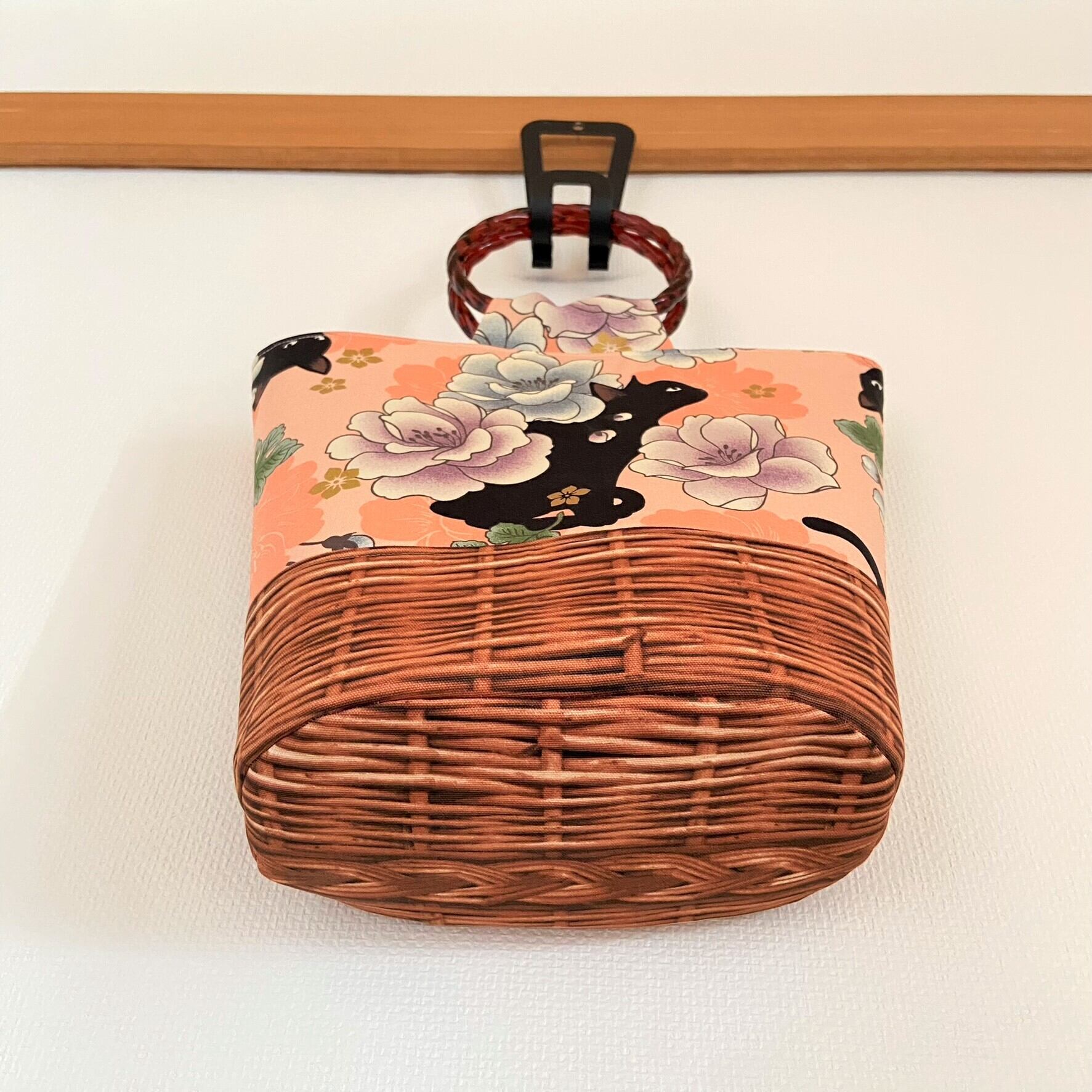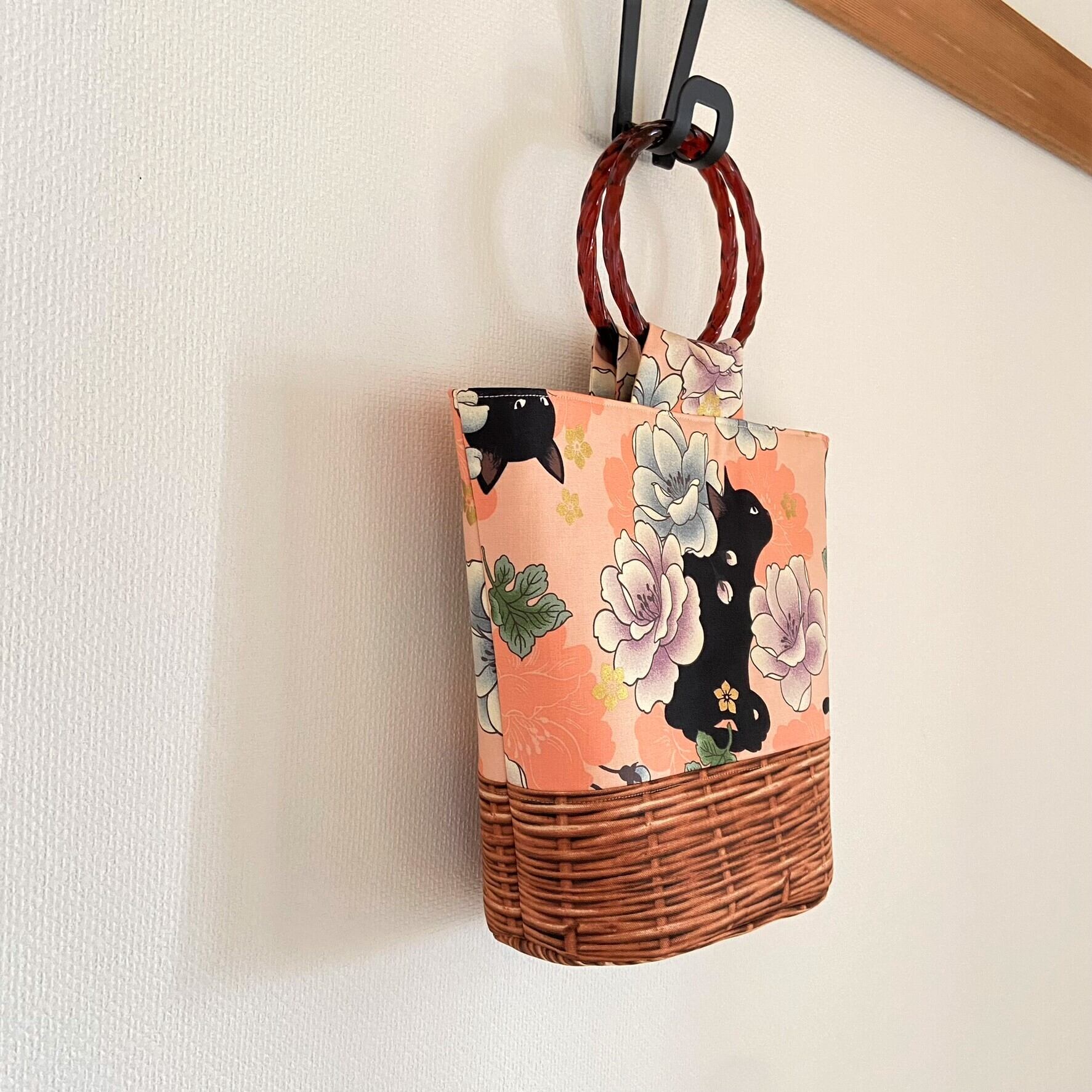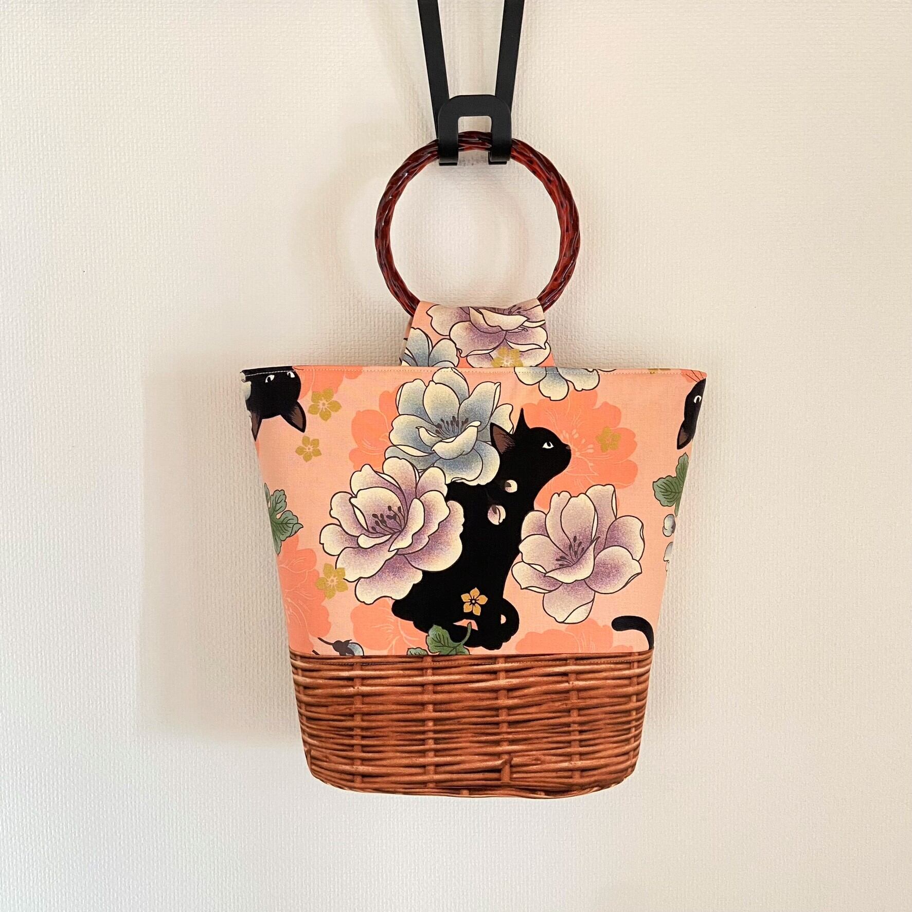 籠バッグをイメージして、猫柄布とラタン風リアルプリントを合わせました。