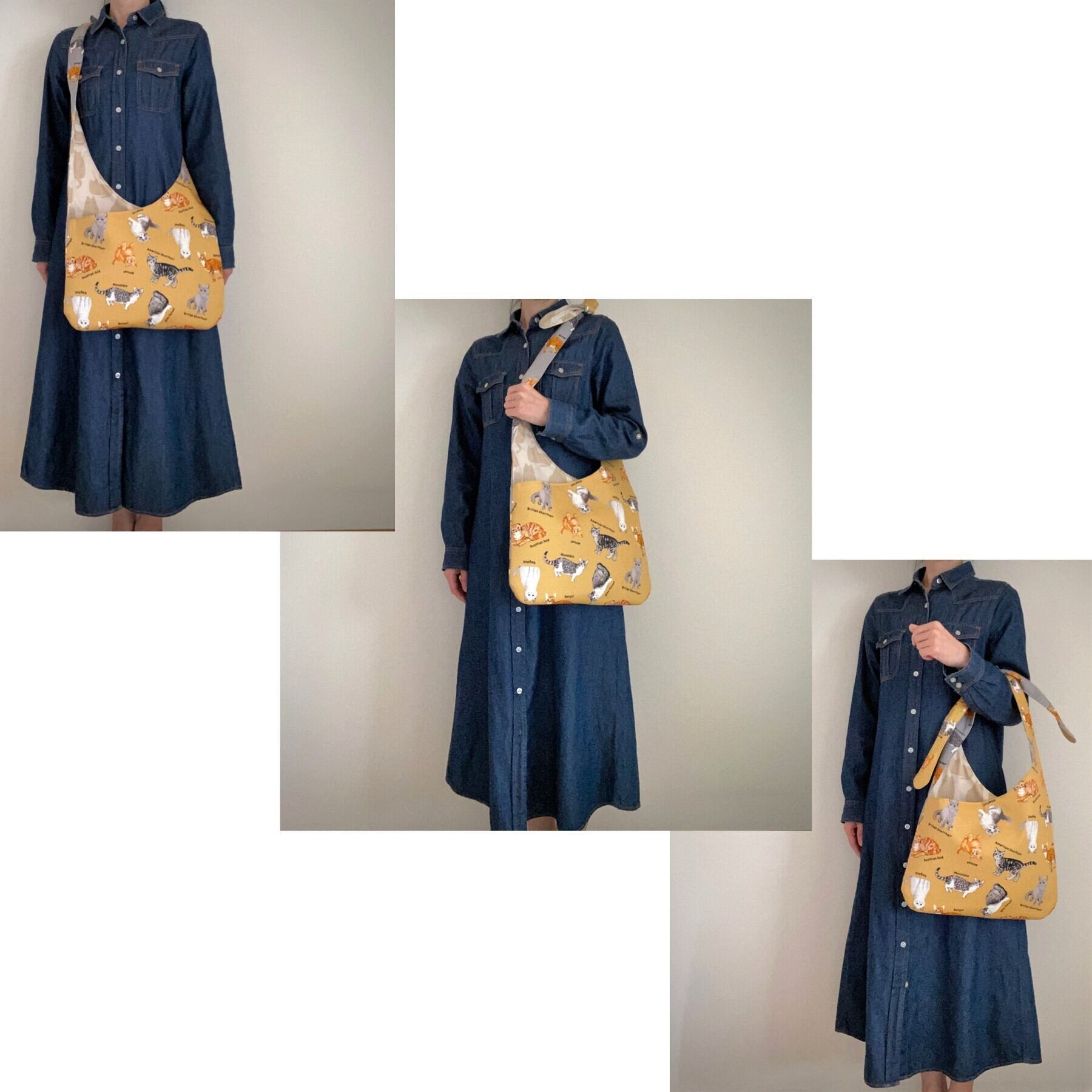 持ち手を結ぶスタイルなので、斜め掛けバッグ、ショルダーバッグ、ハンドバッグと