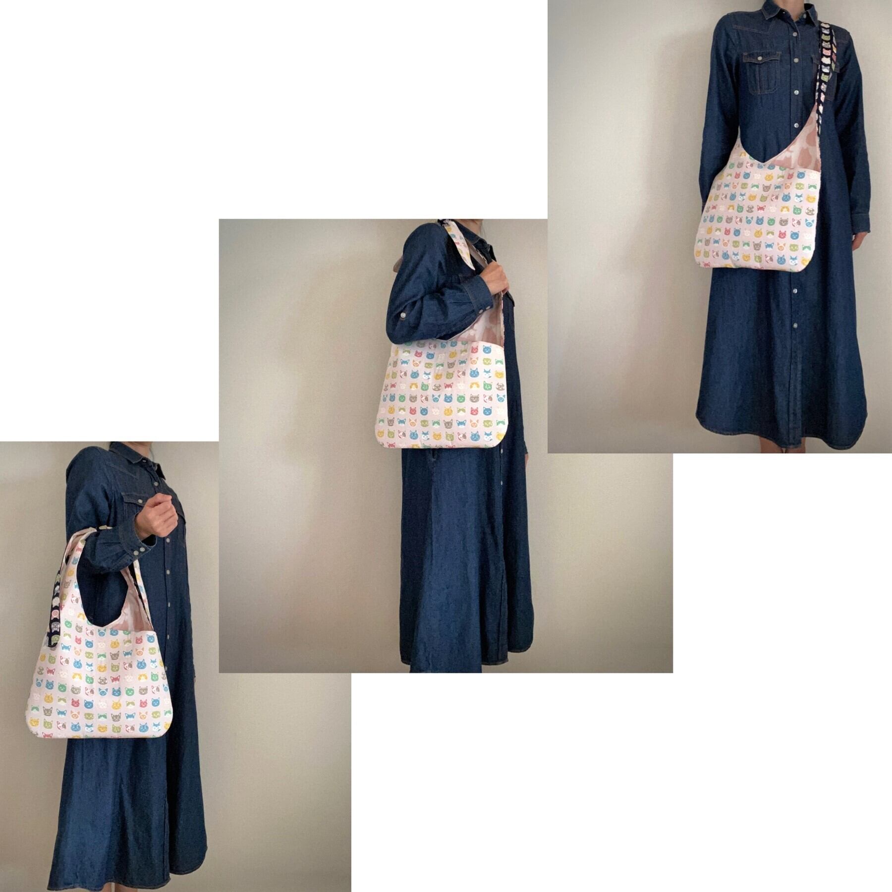持ち手を結ぶスタイルなので、斜め掛けバッグ、ショルダーバッグ、ハンドバッグと