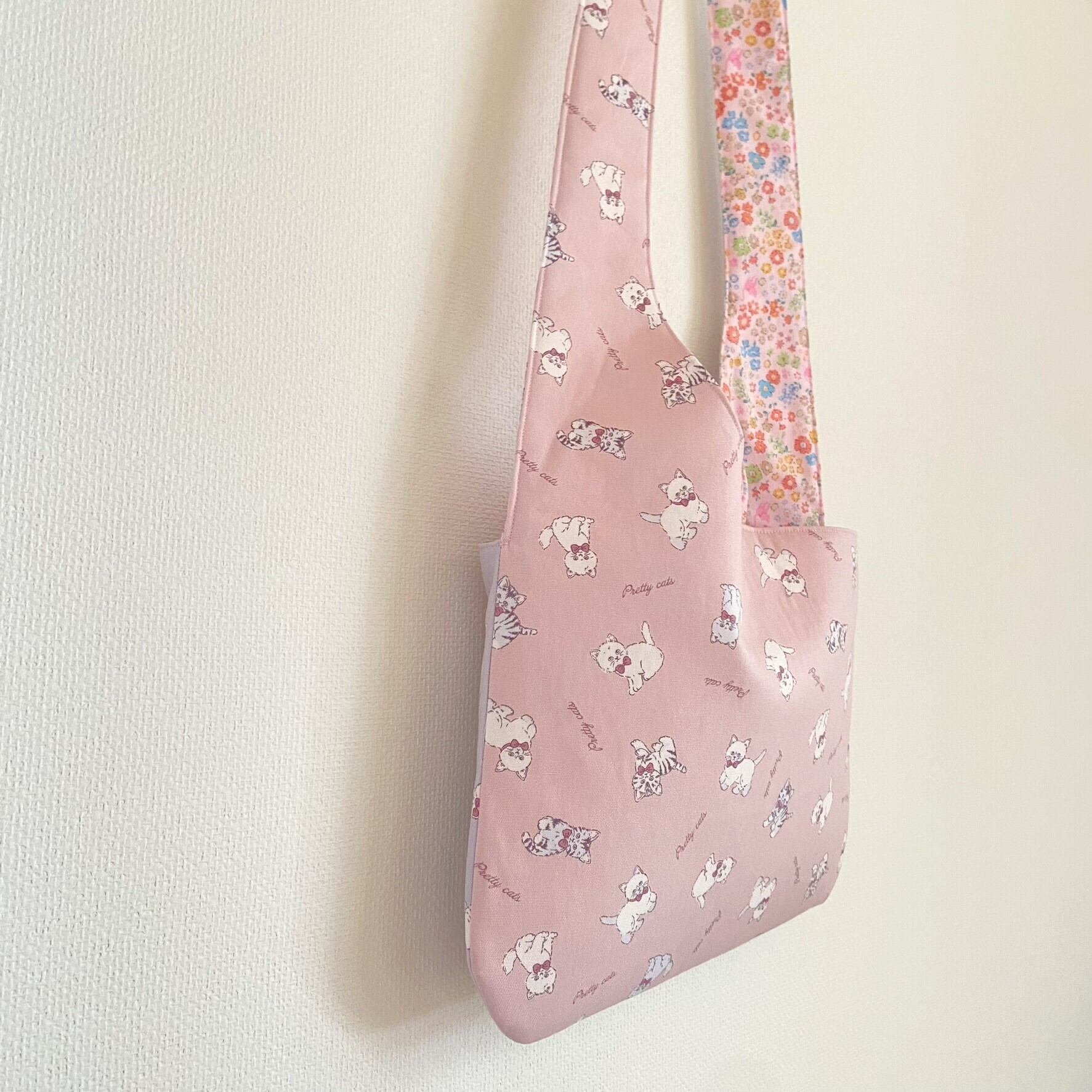 持ち手の部分の内布が見えるので、内布にも猫柄生地を使用しました。