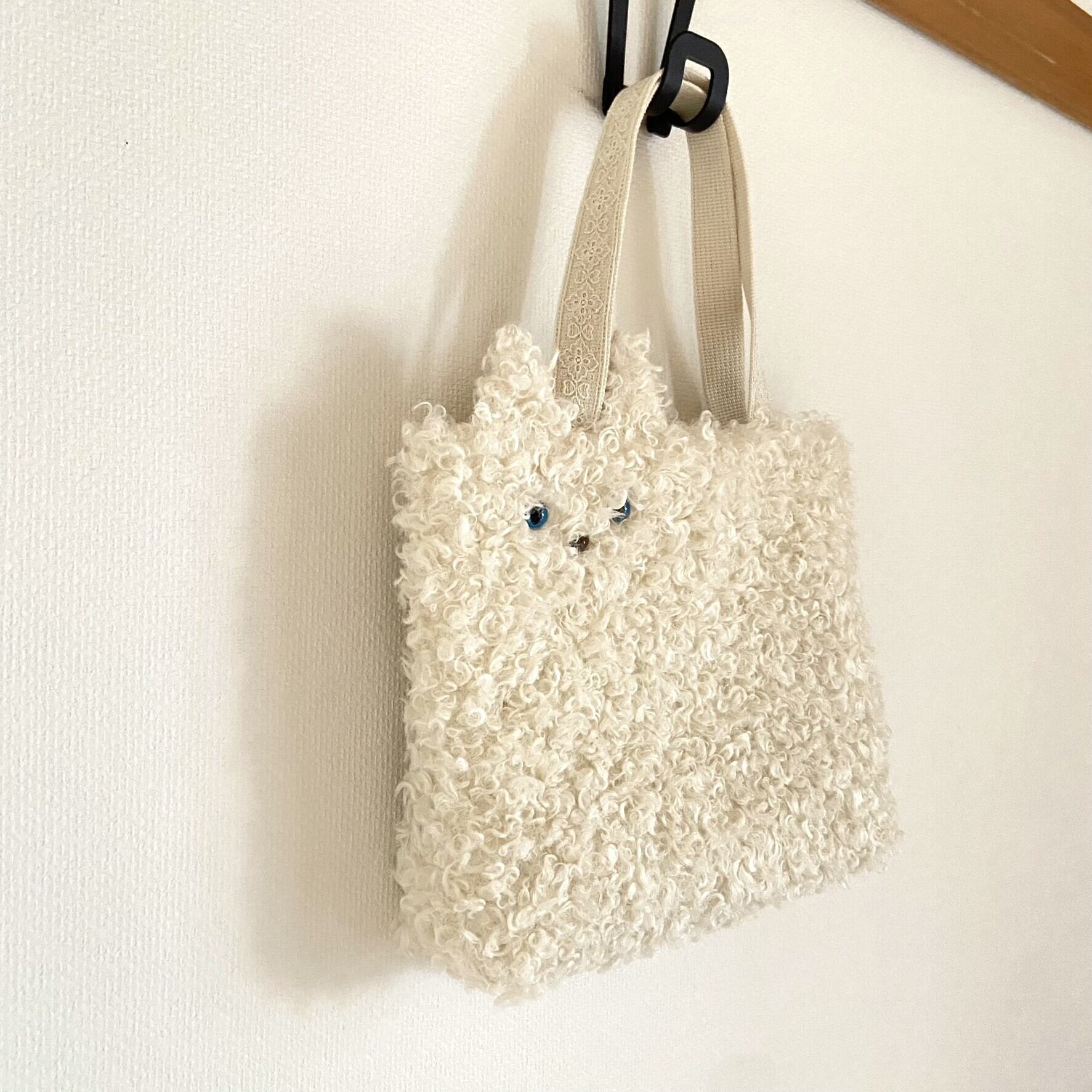 毛足20㎜ほどのくるくる巻き毛のファー生地で、ふわふわと柔かい手触りです。