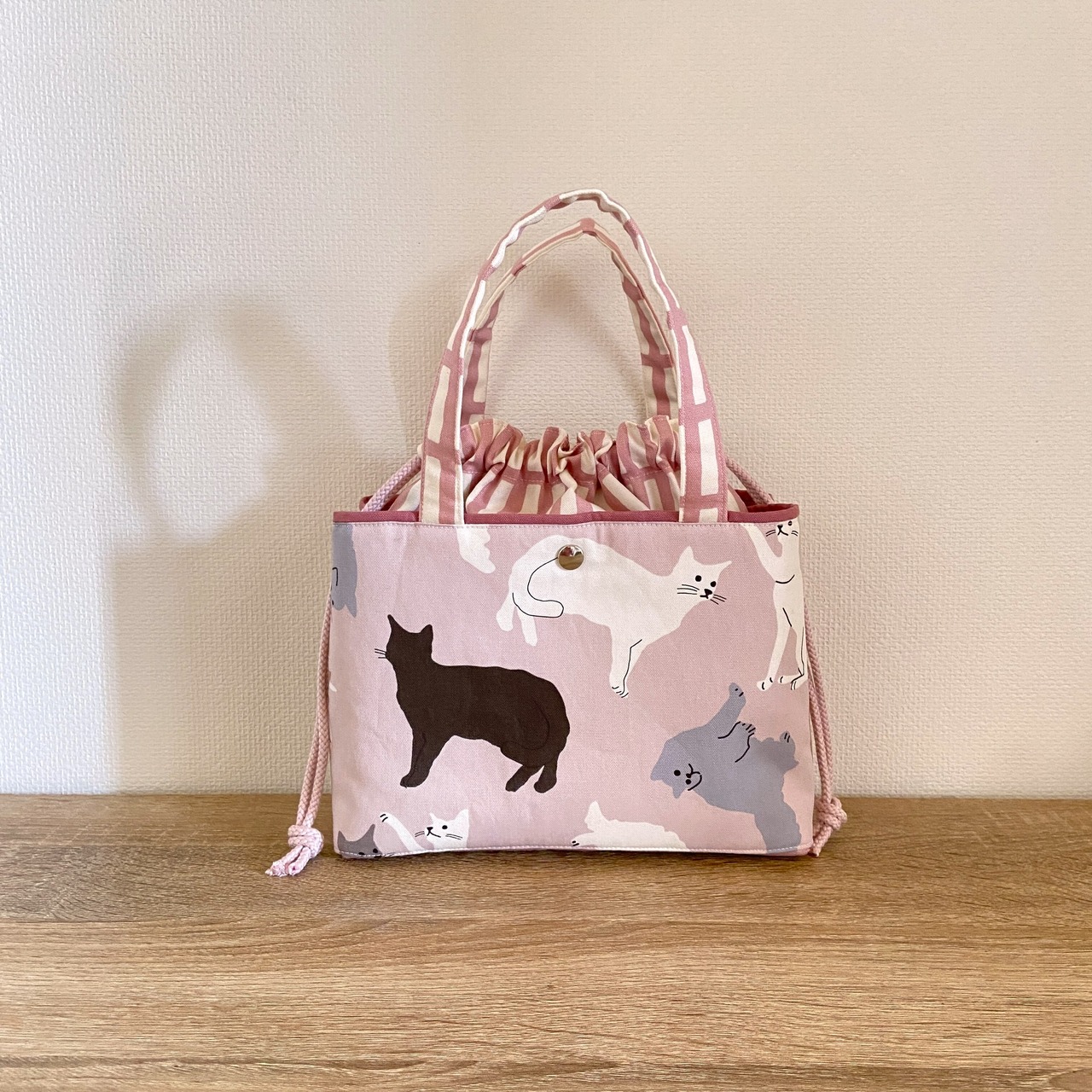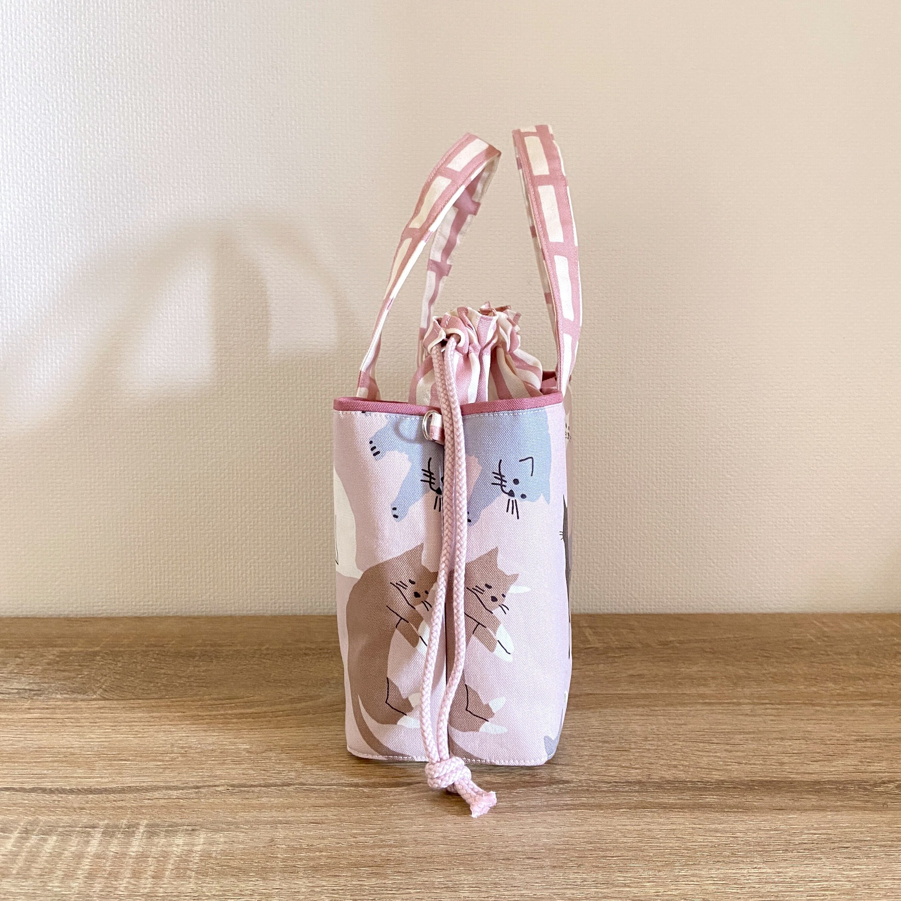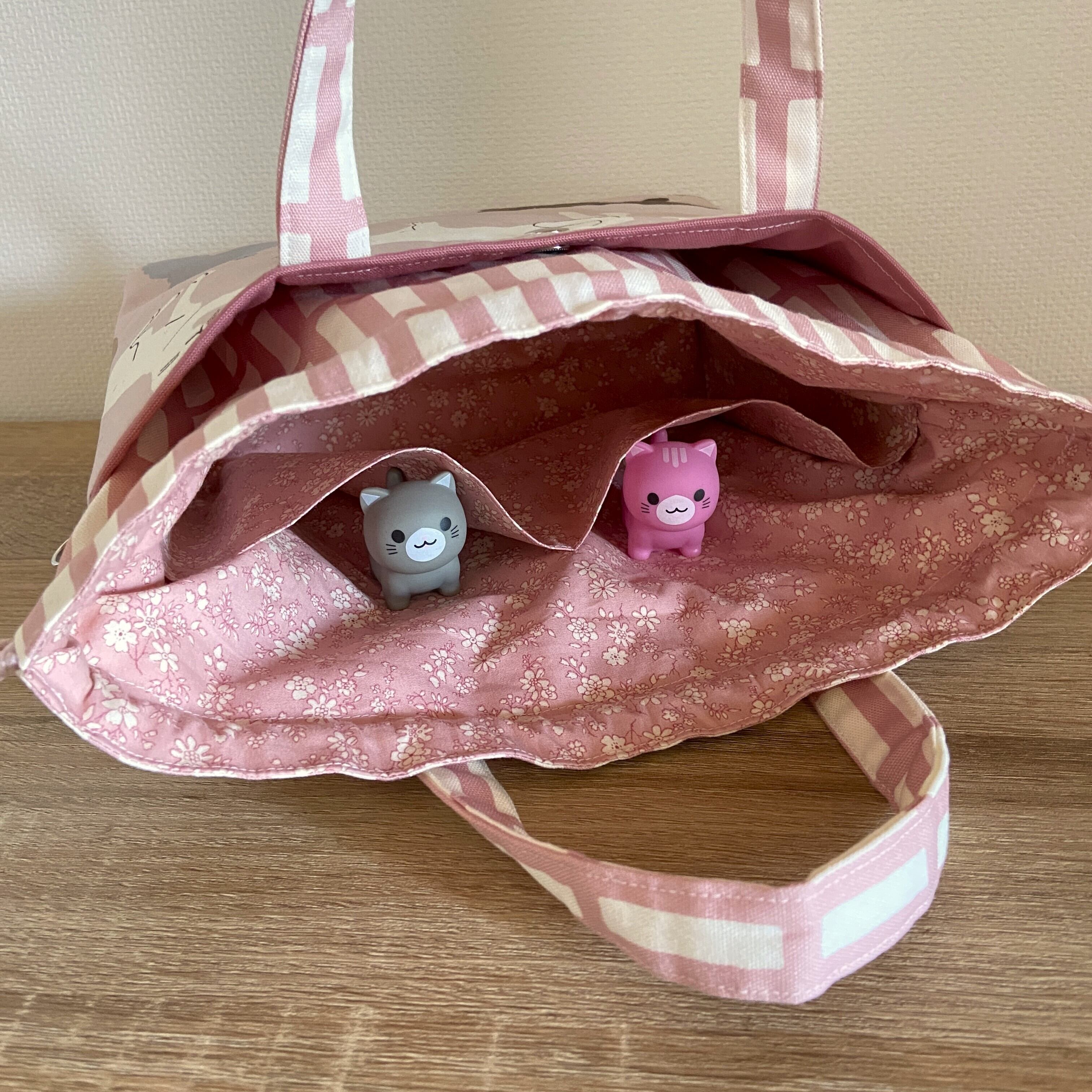 前後に猫柄のあおりポケットがついた巾着バッグです。