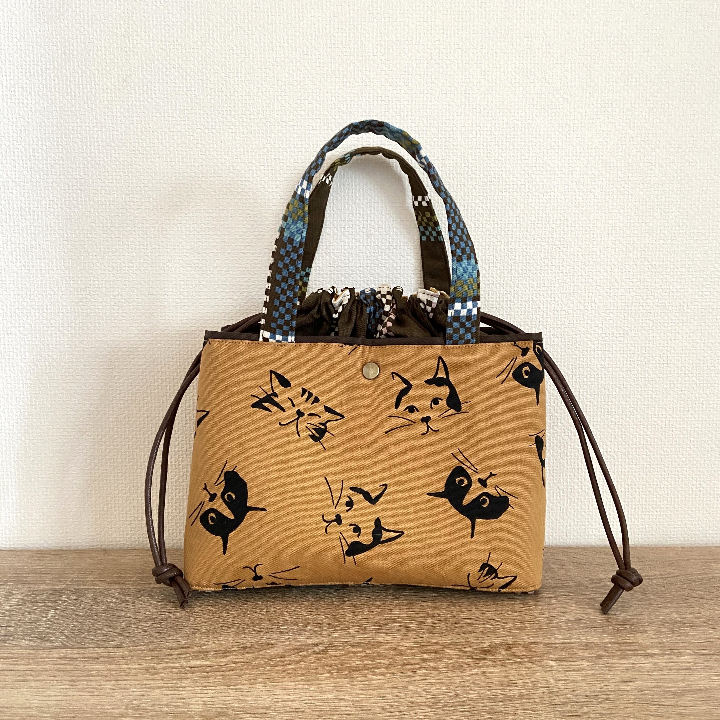 前後に猫柄のあおりポケットがついた巾着バッグです。