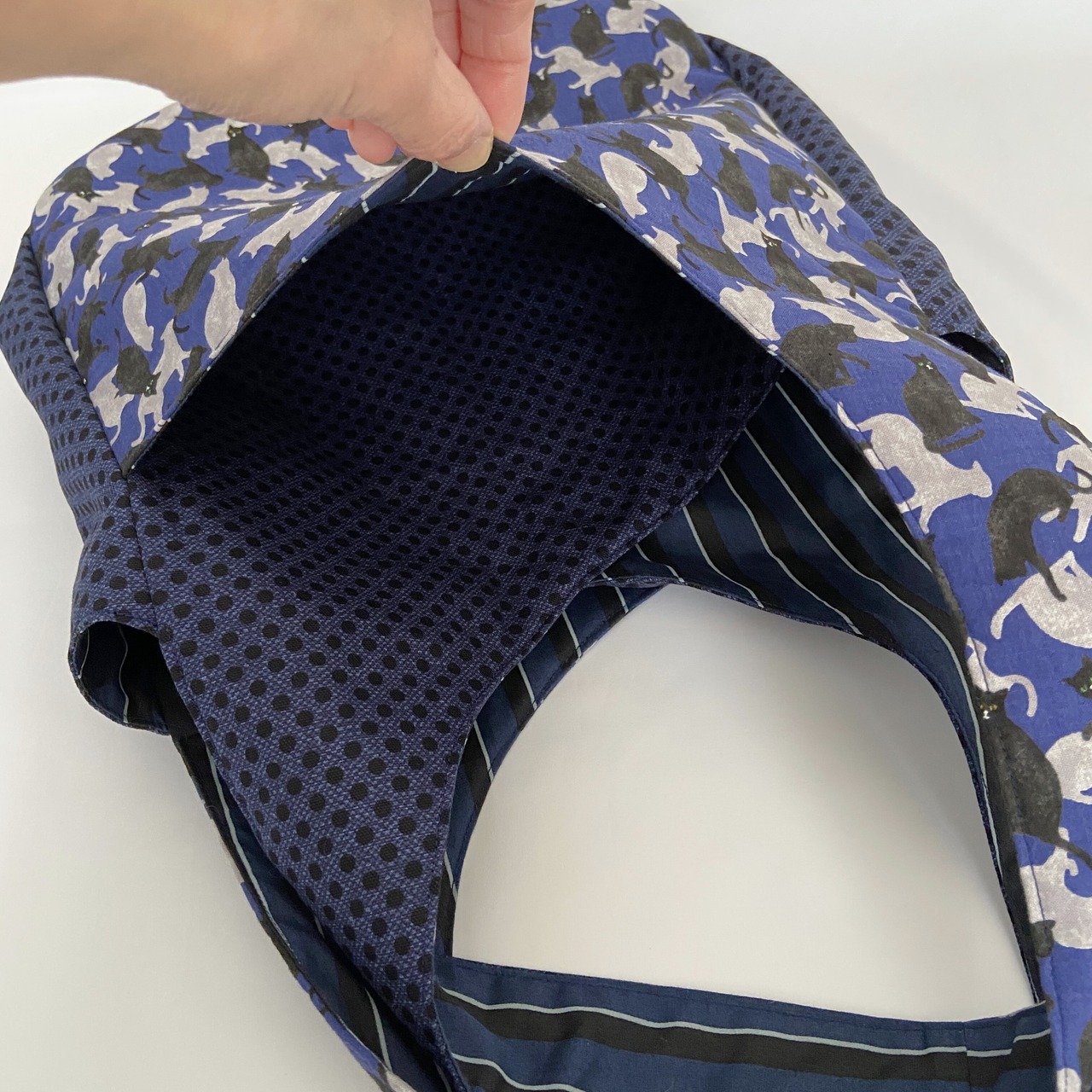 前後ともバッグ本体布が2層仕立てになっており、猫柄部分が大きなポケットになっています。
