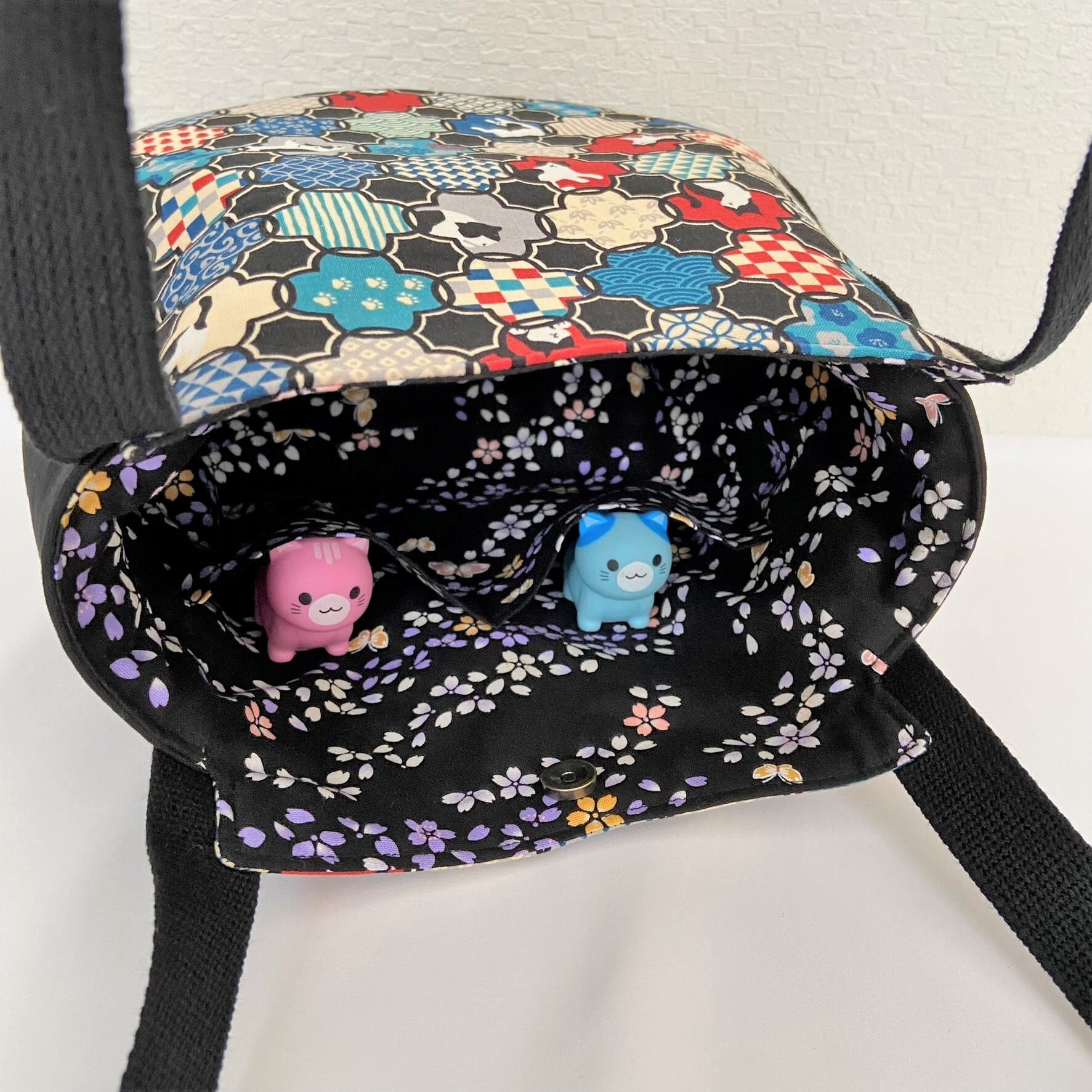 内ポケットは横幅はバッグと同幅、深さ最長16㎝のものを2分割にしてつけました。
