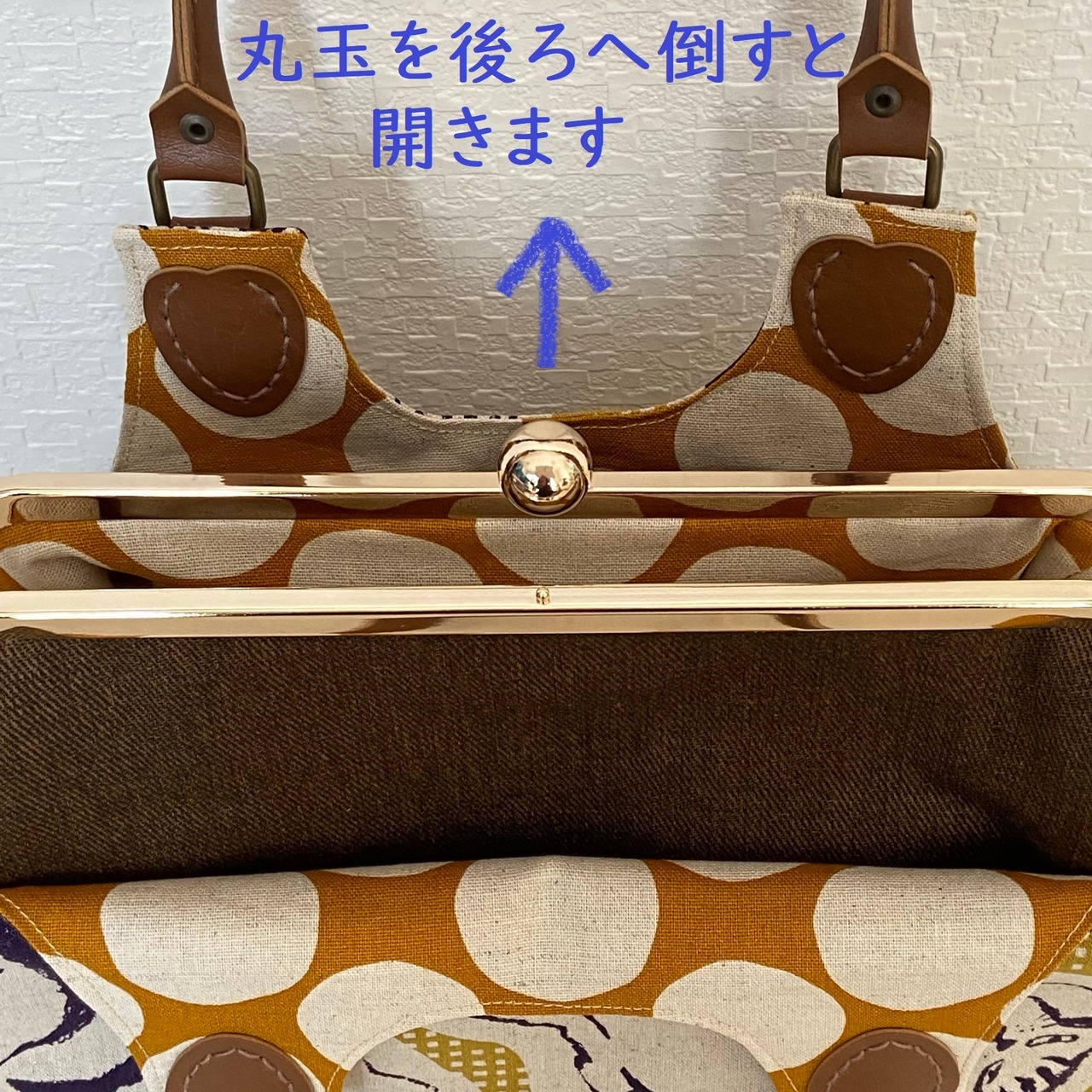 がま口の口金中央についている丸玉を後ろに倒すとロックが外れ口が開きます。
