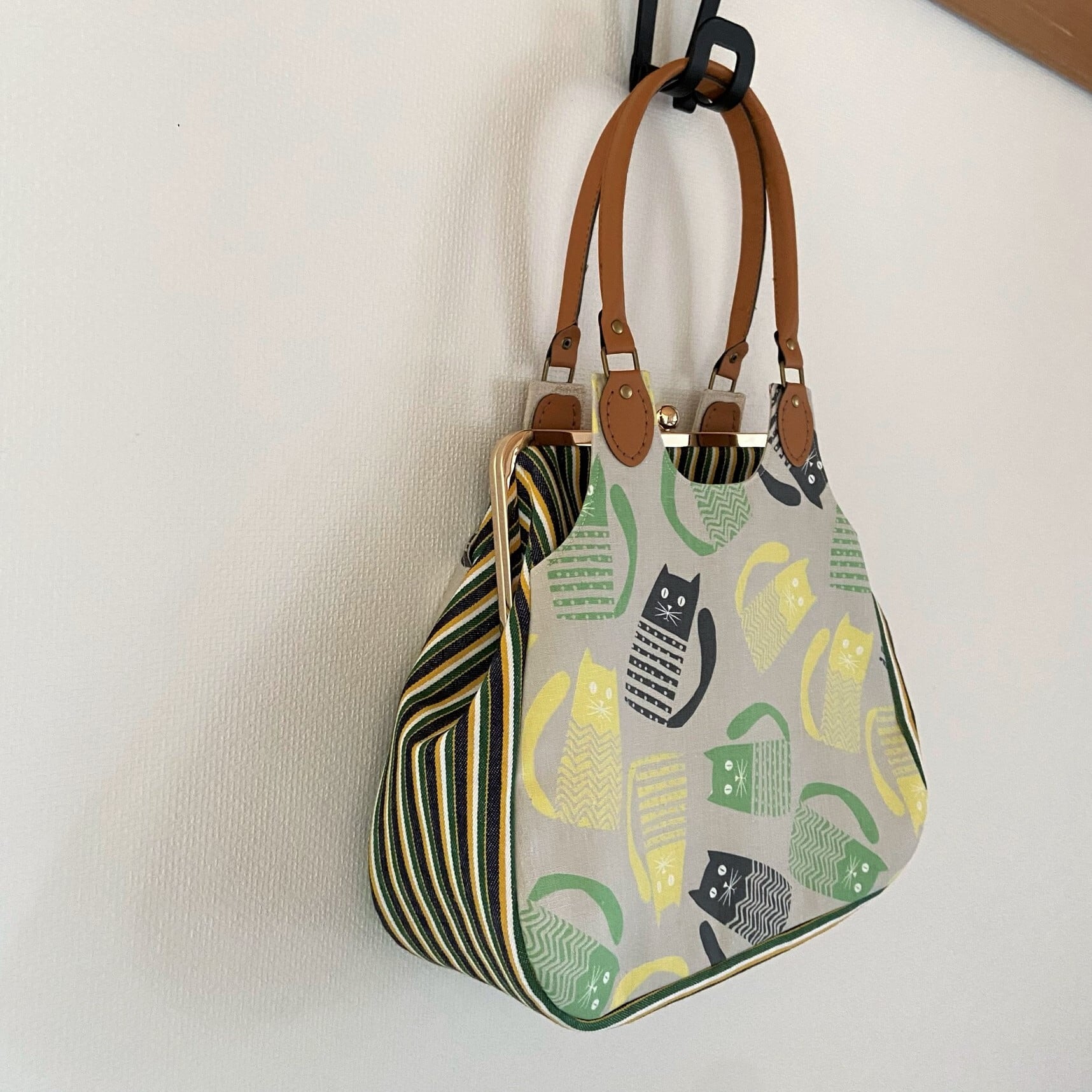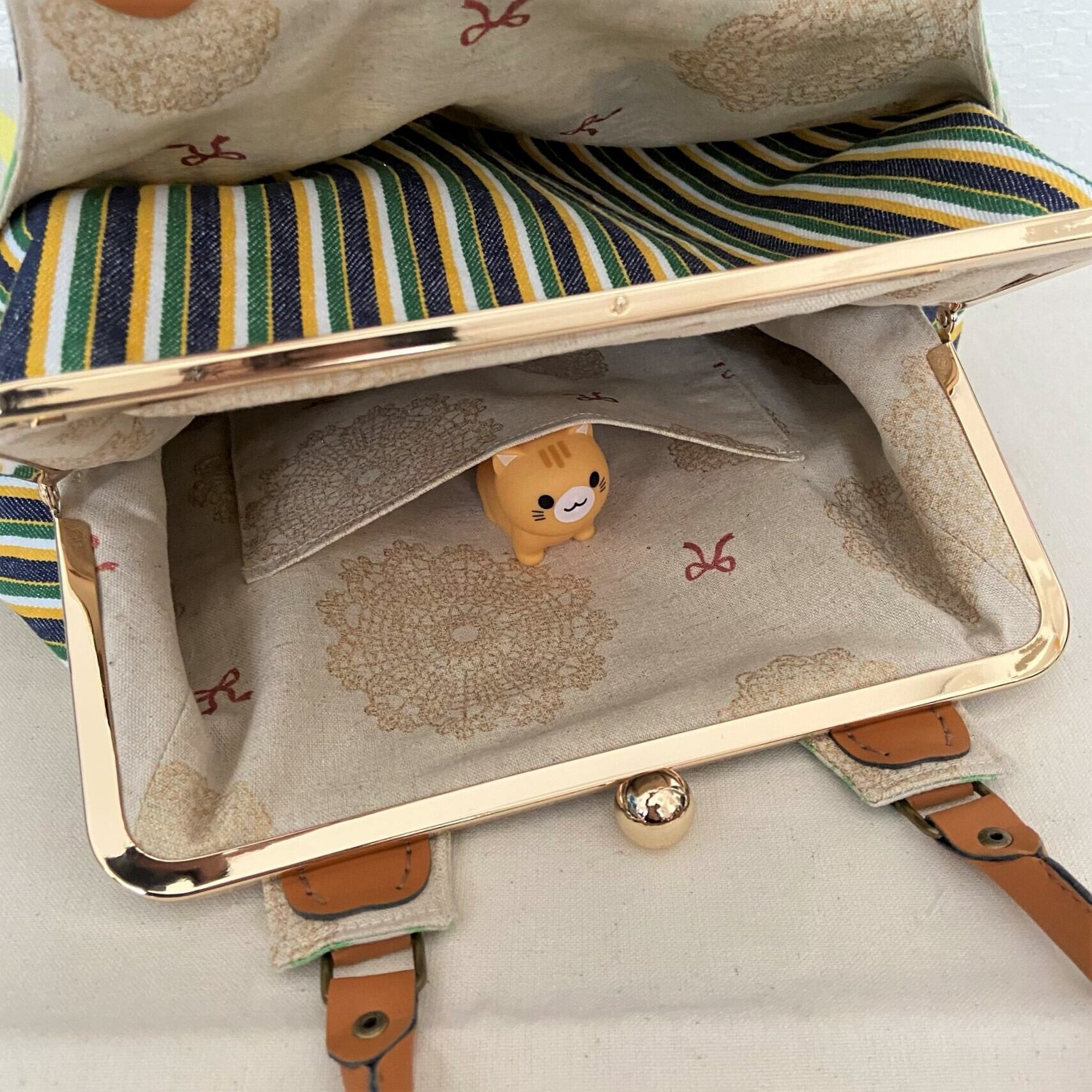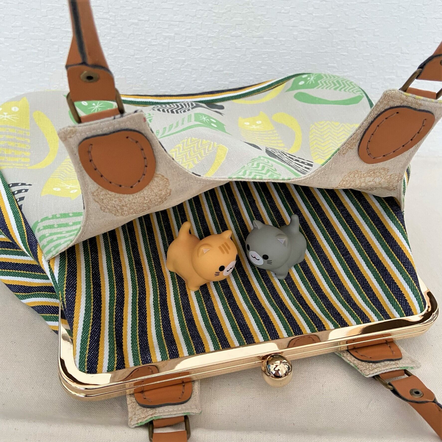 バッグの前と後ろに猫柄布の大きなポケットがあります。