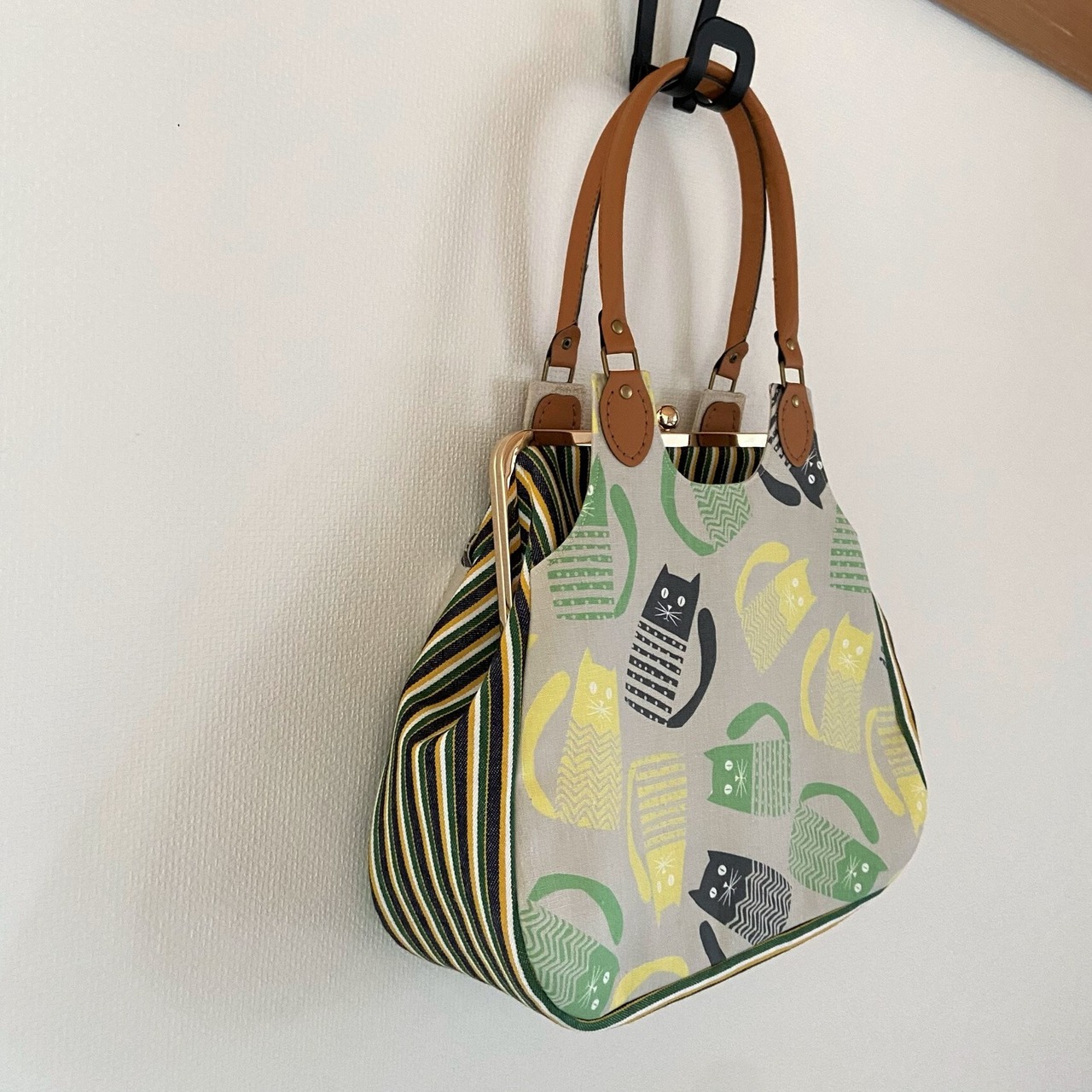 合皮の持ち手を付けて上品な印象のバッグに仕上げました。