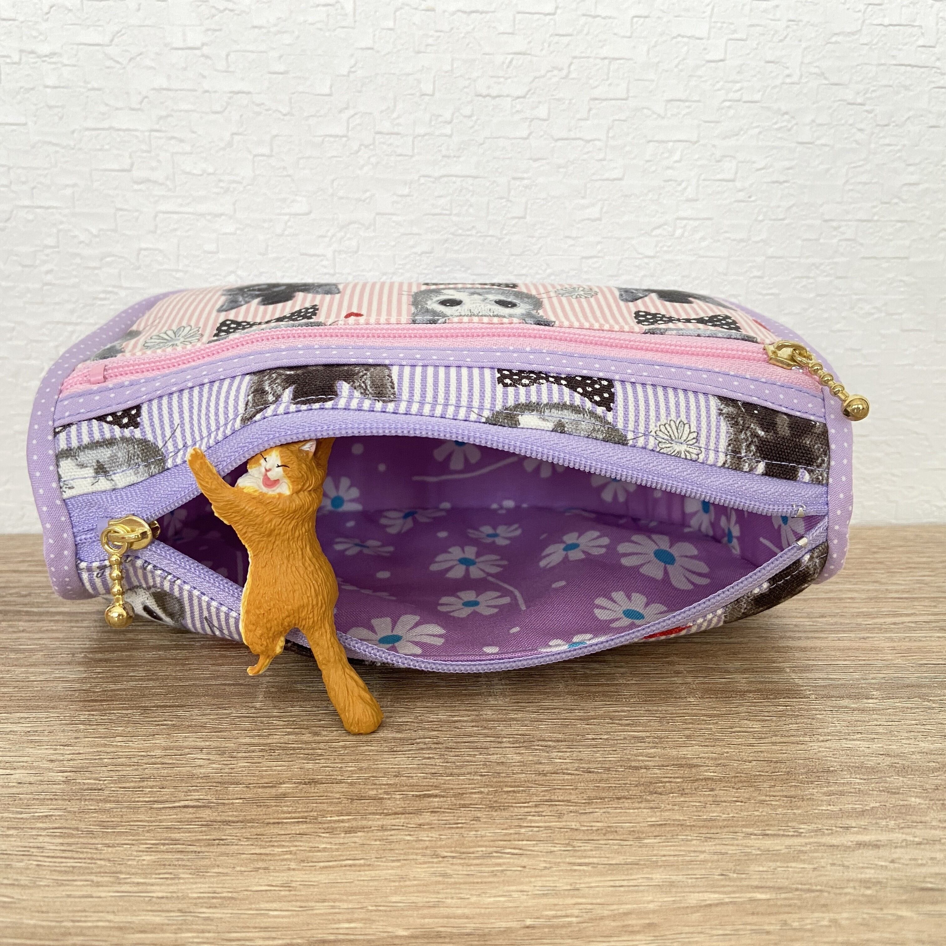 前面に色違いの猫柄布を使ったファスナーポケットがついていますので