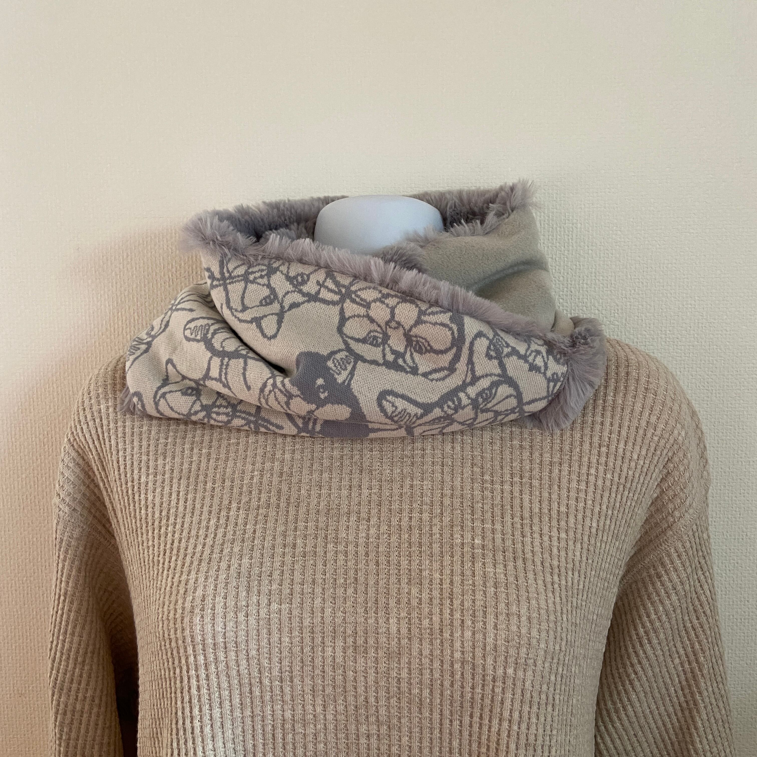 猫柄ジャガードニットとフリース生地、ソフトボアを合わせたネックウォーマーです。