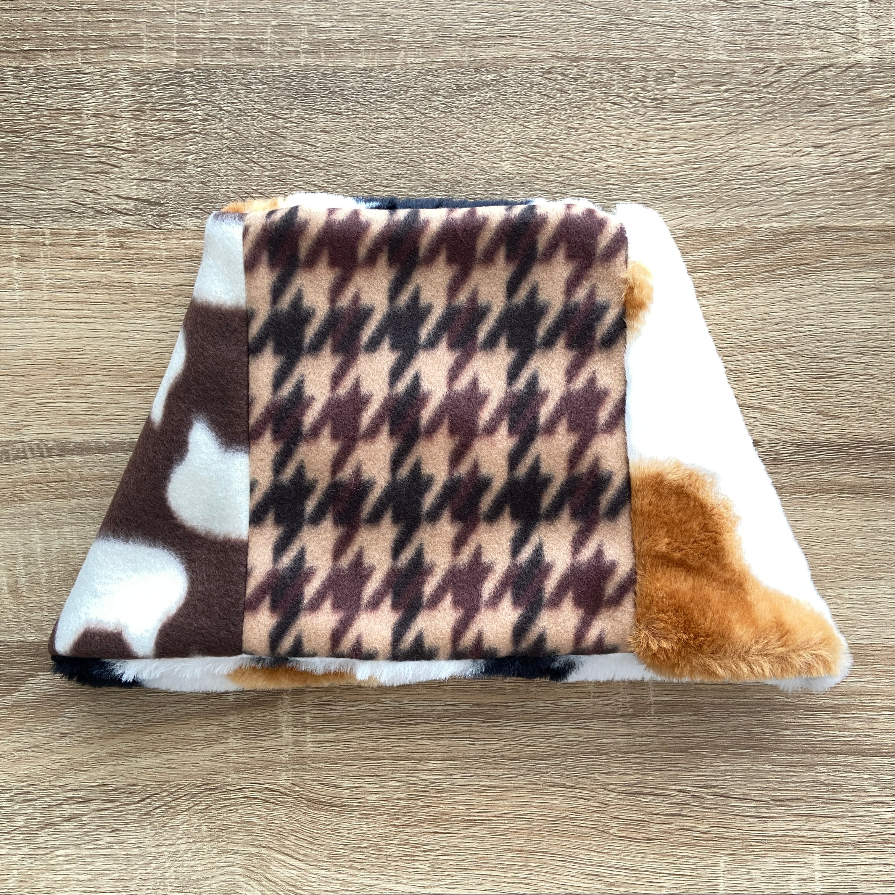 猫柄フリースと千鳥チェック柄フリース、三毛柄ファーを合わせたネックウォーマーです。