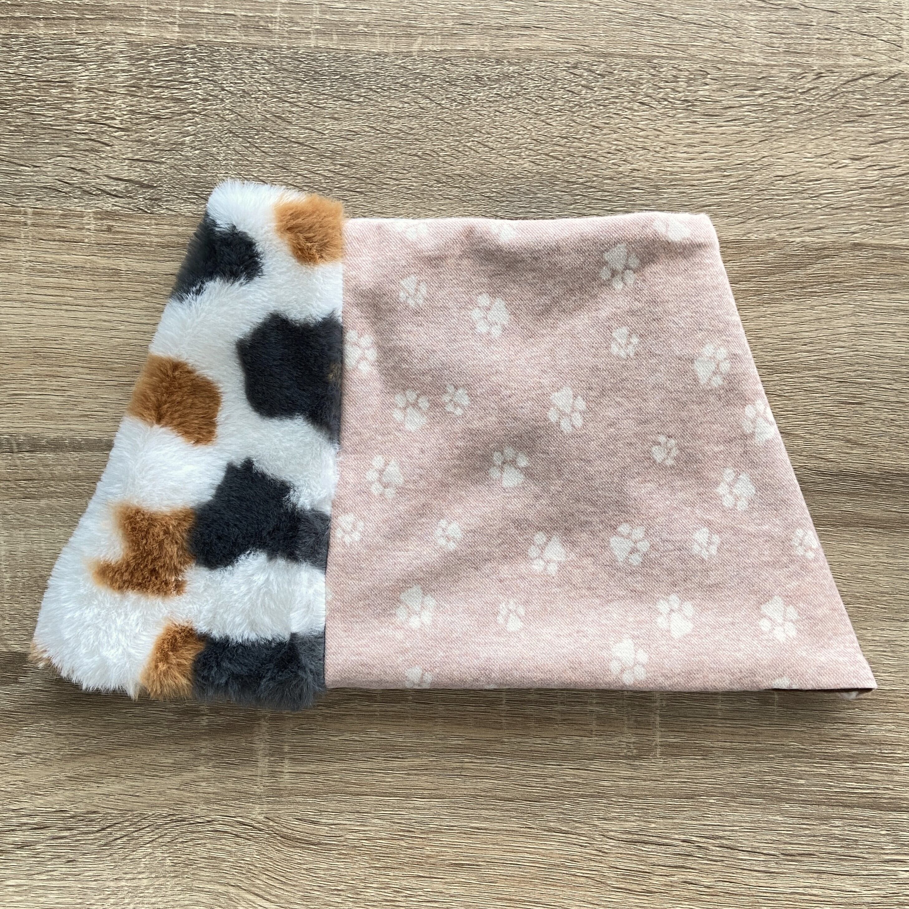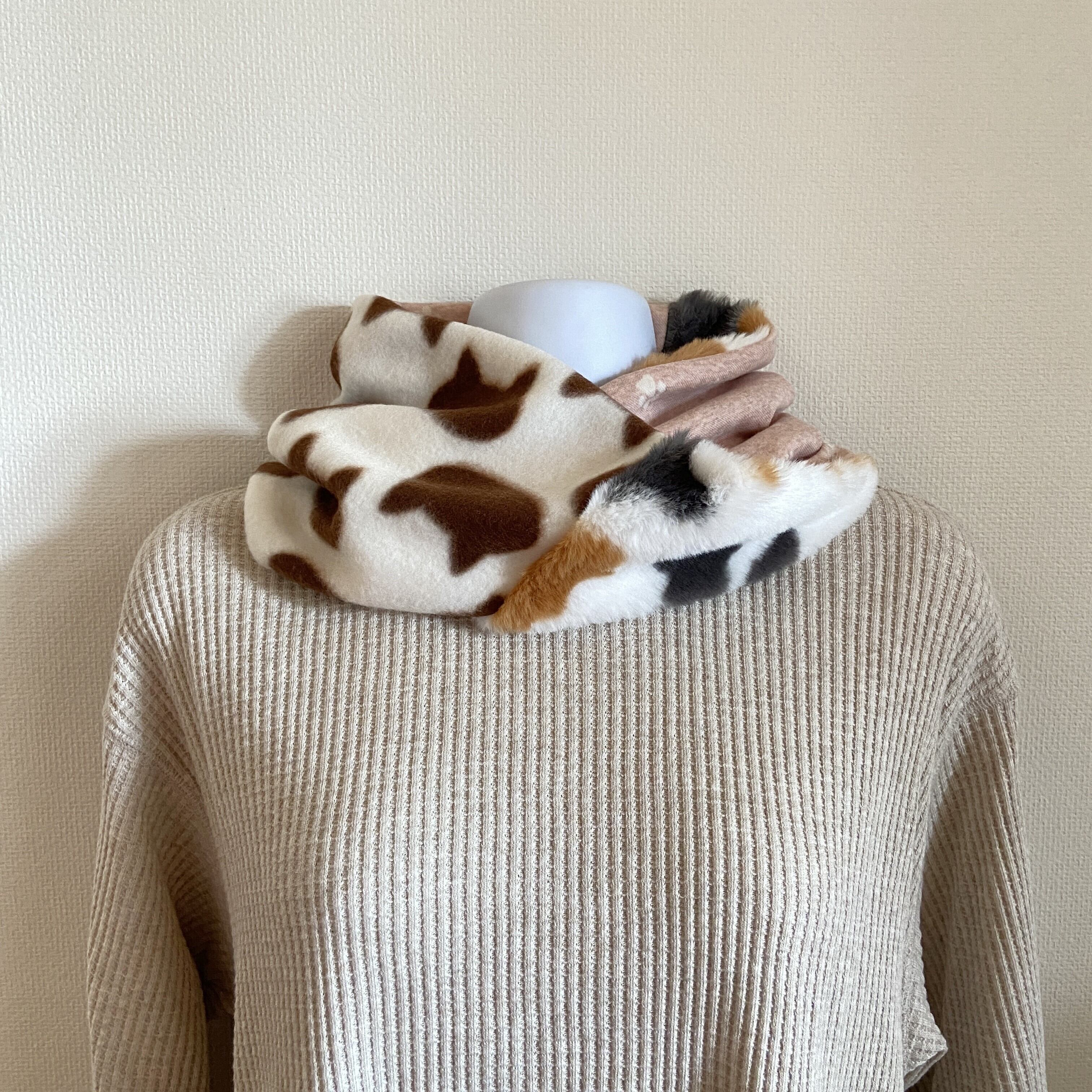 猫柄フリースと肉球柄ジャガードニット、三毛柄ファーを合わせたネックウォーマーです。