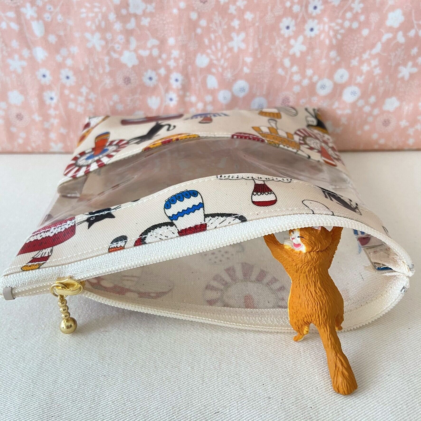 猫柄ラミネート生地と透明ビニール生地を合わせたポーチです。
