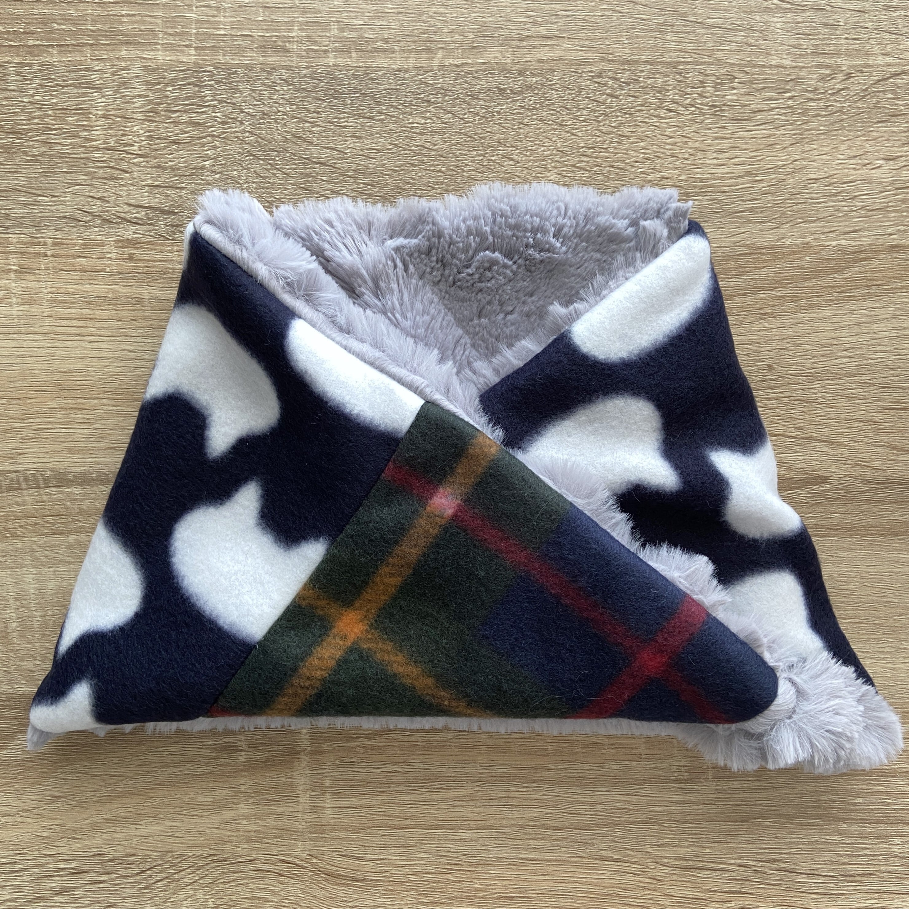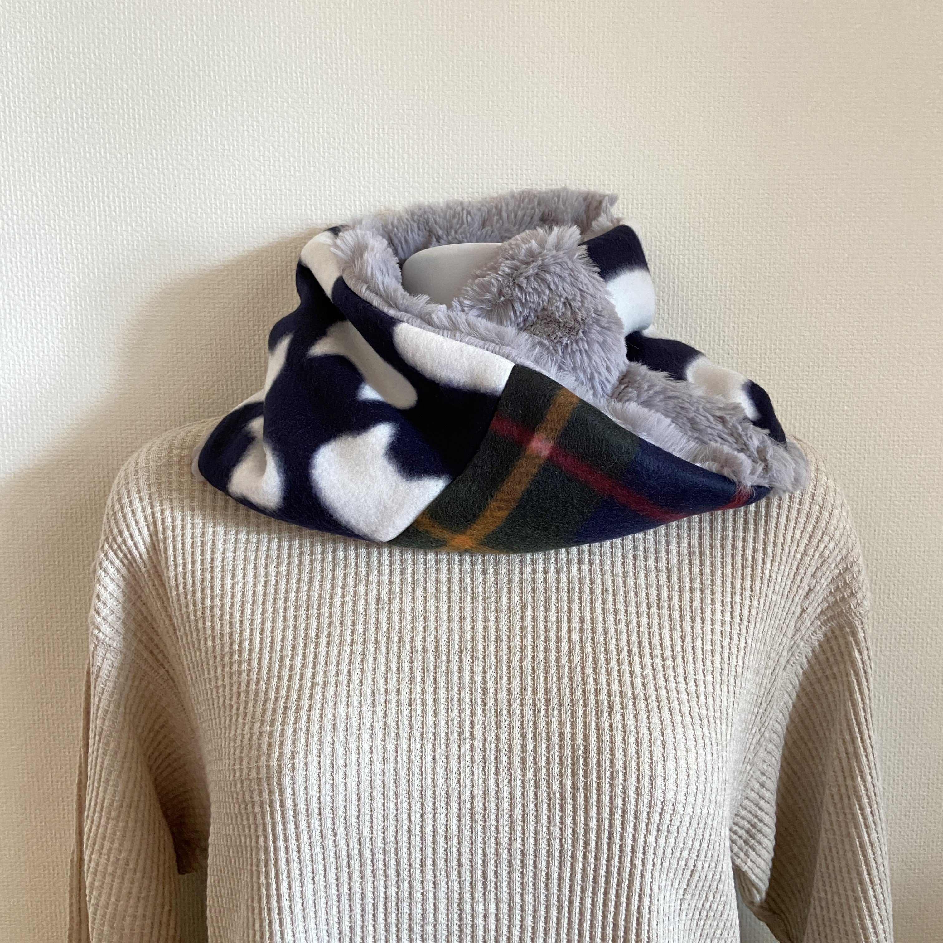 猫柄フリースとチェック柄フリース、ソフトボアを合わせたネックウォーマーです。