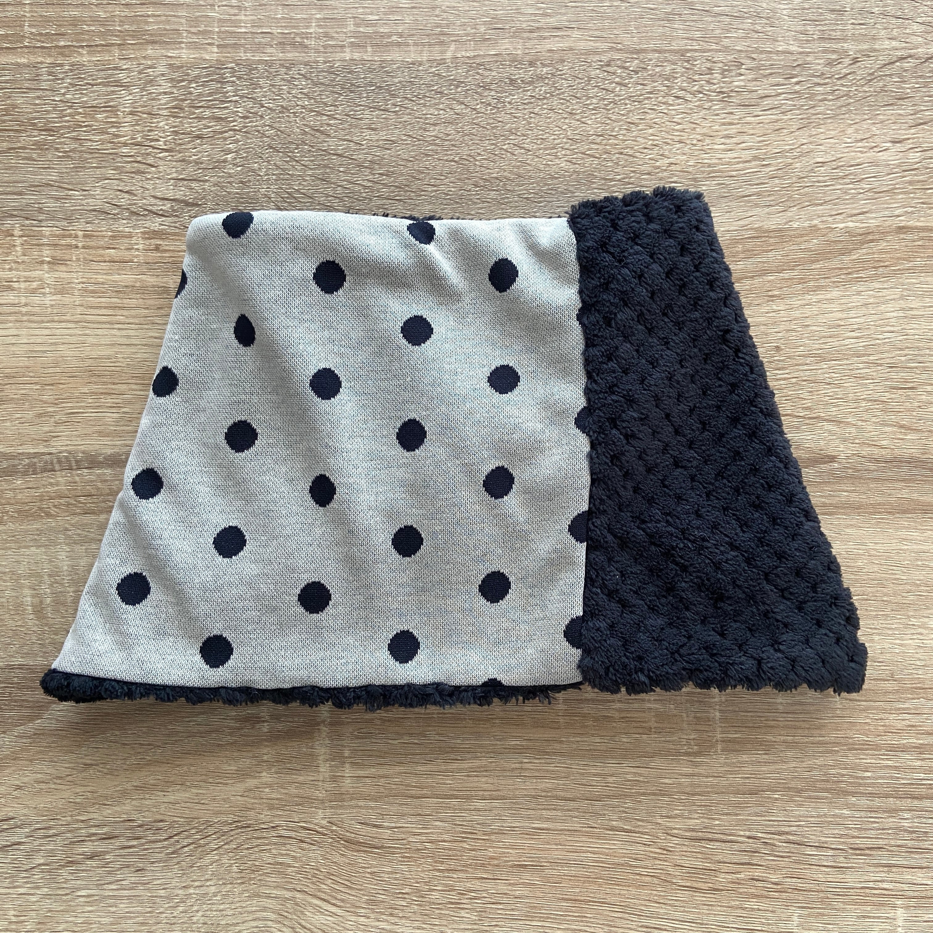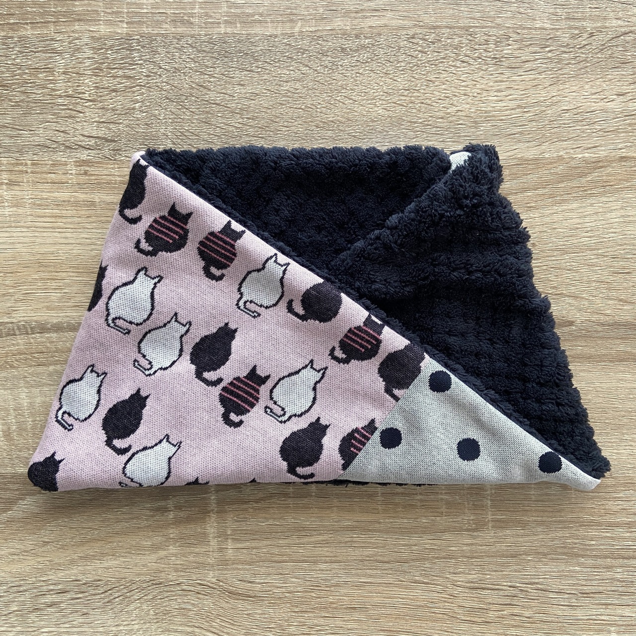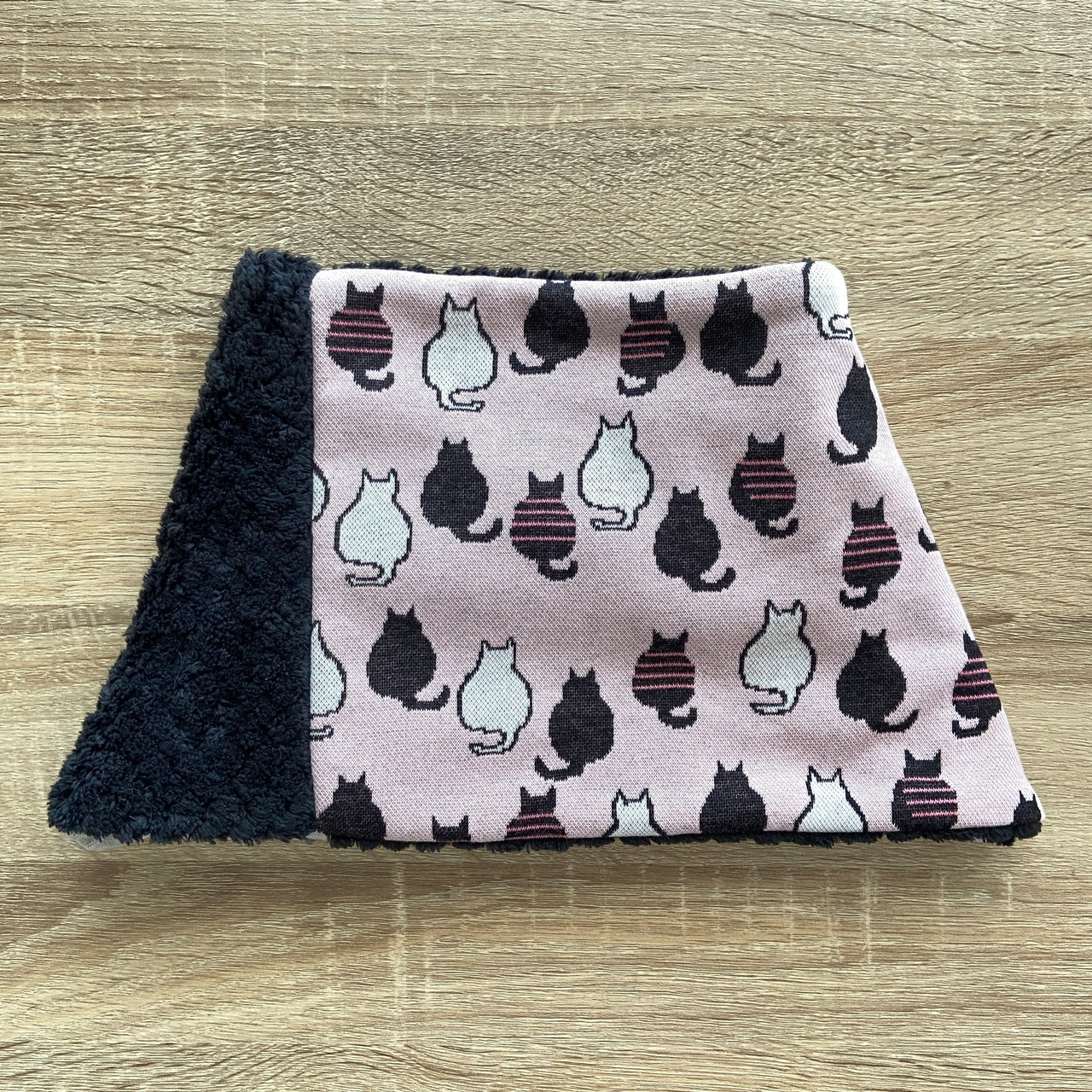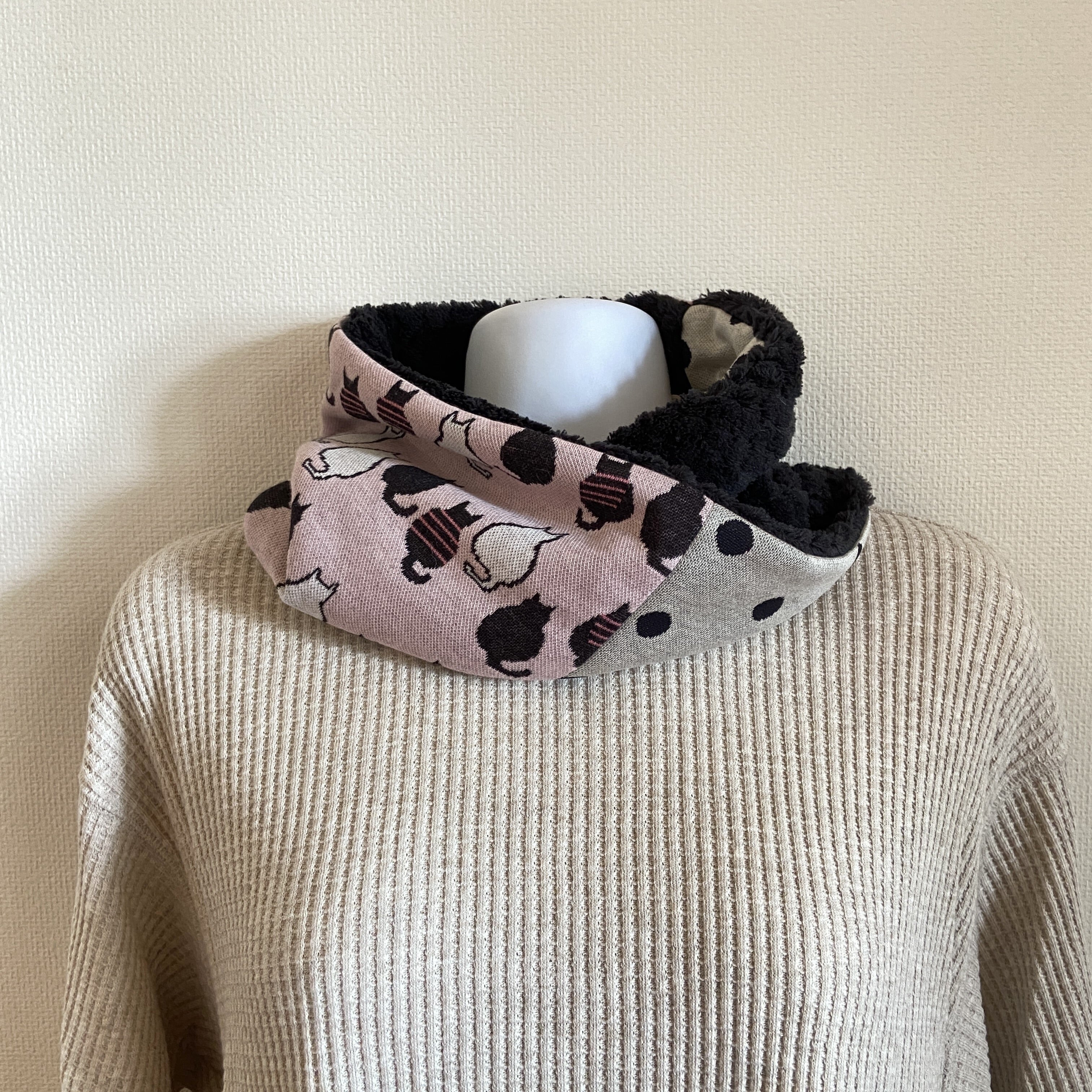 猫柄とドットのジャガードニットとパイナップルボアを合わせたネックウォーマーです。